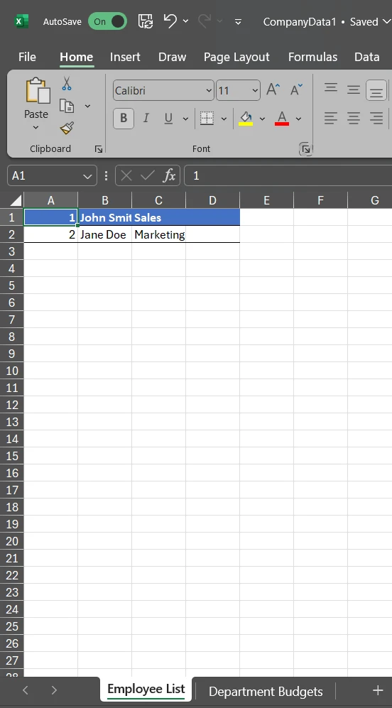 workBook.SaveAs("CompanyData.xlsx")DataSet内の各DataTableは Excel ファイル内で個別のワークシートになり、データの論理的な分離が維持されます。 このアプローチは、異なるデータカテゴリごとに個別のワークシートを必要とする包括的なレポートを作成する際に特に有用です。DataSetsに関するMicrosoftのドキュメントによれば、この構造はデータベーススキーマのリレーショナル性を反映しています。