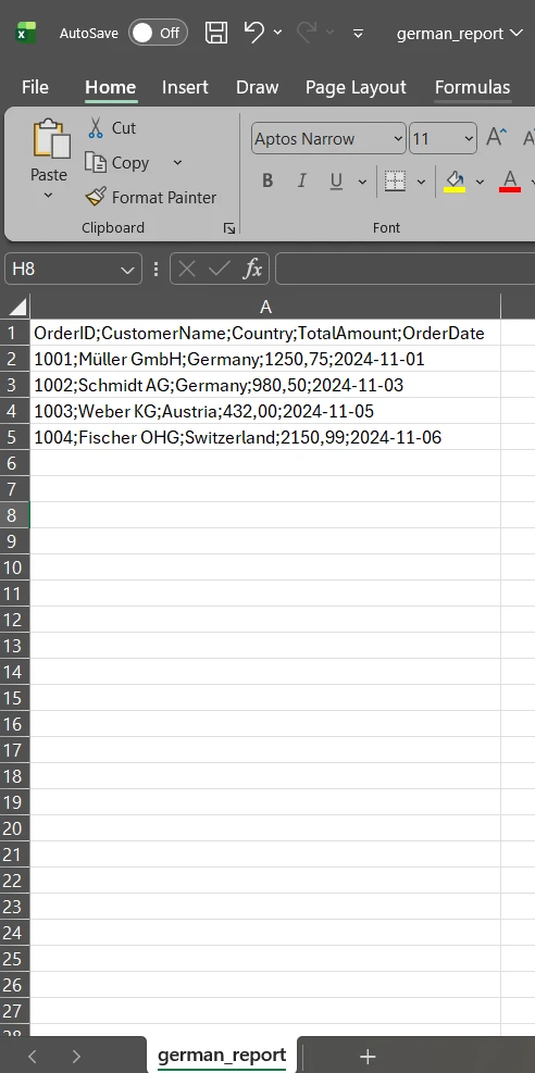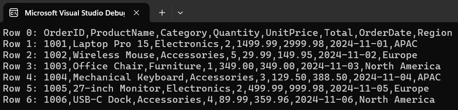 IRONXLの使用 C#高速CSVリーダー:IronXLによるCSV処理の合理化 カーティス・チャウ 更新日:1月 5, 2026 IronXL をダウンロード NuGet ダウンロード DLL ダウンロード 無料トライアル LLM向けのコピー LLM向けのコピー LLM 用の Markdown としてページをコピーする ChatGPTで開く このページについてChatGPTに質問する ジェミニで開く このページについてGeminiに問い合わせる Grokで開く このページについてGrokに質問する 困惑の中で開く このページについてPerplexityに問い合わせる 共有する Facebook で共有 Xでシェア(Twitter) LinkedIn で共有 URLをコピー 記事をメールで送る .NETアプリケーションでCSVファイルを効率的に読み取る CSVファイルを効率的に読み取ることは、データ移行プロジェクトから毎日何千ものレコードを解析するレポートシステムまで、.NETアプリケーションの一般的な要件です。 開発者は、生のカンマ区切りデータから、設定やデバッグに何時間もかかることなく、数分で使用可能なオブジェクトに移行できるCSVライブラリを必要としています。 IronXLは、CSV処理への高速で直感的なアプローチを提供し、スプレッドシート操作につきものの複雑さを解消します。 わずか数行のコードで、どんなCSVファイルも、分析、変換、データベース保存の準備が整った実行可能なデータ構造になります。 Microsoft Officeのインストールは不要で、複雑なセットアップも必要なく、WindowsからLinux、クラウドデプロイメントまで、完全なクロスプラットフォームに対応しています。 この実績あるライブラリは、単純なデータファイルから複雑なエンタープライズワークフローまで、あらゆるものを処理します。 CSVライブラリを使用してC#でCSVファイルをすばやく読み込むには? C#でCSVデータを読み込む最短の道は、WorkBook.LoadCSVメソッドから始まります。 この単一のメソッド呼び出しは、ファイルの読み込みを処理し、各行を解析し、自動的に構造を作成し、データアクセスの準備が整った完全に機能するワークブックオブジェクトを返します。 手動で新しいStreamReaderを作成し、各行を自分で処理するのとは異なり、このアプローチでは構文解析のワークフロー全体を内部で処理します。 using IronXL; // Load CSV file directly into a workbook WorkBook workbook = WorkBook.LoadCSV("sales_data.csv", fileFormat: ExcelFileFormat.XLSX); // Access the default worksheet containing CSV data WorkSheet sheet = workbook.DefaultWorkSheet; // Read specific cell values string customerName = sheet["A2"].StringValue; decimal orderTotal = sheet["D2"].DecimalValue; // Iterate through all data rows foreach (var row in sheet.Rows) { Console.WriteLine($"Row {row.RowNumber}: {row.Columns[0].Value}"); } using IronXL; // Load CSV file directly into a workbook WorkBook workbook = WorkBook.LoadCSV("sales_data.csv", fileFormat: ExcelFileFormat.XLSX); // Access the default worksheet containing CSV data WorkSheet sheet = workbook.DefaultWorkSheet; // Read specific cell values string customerName = sheet["A2"].StringValue; decimal orderTotal = sheet["D2"].DecimalValue; // Iterate through all data rows foreach (var row in sheet.Rows) { Console.WriteLine($"Row {row.RowNumber}: {row.Columns[0].Value}"); } $vbLabelText $csharpLabel このコードはIronXLでCSVを読み書きするためのコアとなるワークフローを示しています。 LoadCSVメソッドは、ファイル名とオプションのフォーマット指定を受け付け、カンマ区切り文字を自動的に検出し、各フィールドの値を対応するセルにパースします。 パーサーはデフォルトで最初の行をヘッダーデータとして扱い、カラム名にすぐにアクセスできるようにします。 入力 C#高速CSVリーダー:IronXLによるCSV処理の合理化: 画像1 - サンプルCSV入力 出力 C#高速CSVリーダー:IronXLによるCSV処理の合理化: 画像2 - コンソール出力. DefaultWorkSheet プロパティは、ワークシート名やインデックスの知識を必要とせずに、解析されたデータへの即時アクセスを提供します。 そこから、セルの値は、おなじみのExcelスタイルのアドレス指定(A2、B5)を使用するか、foreachループを使用して行と列の反復によって取得することができます。 このアプローチが開発者にとって特に効率的なのは、定型的なコードを排除できることです。 ストリーム管理も、新しい行ごとに手動で分割する操作も、定義する設定クラスもありません。var reader = new StreamReader(path)と書いたり、string line変数を手動で処理する必要はありません。 ワークブックオブジェクトは、スプレッドシートが自然に動作する方法を反映した直感的なAPIを公開しながら、内部の複雑さをすべて処理します。 型付き値アクセサ(StringValue、DecimalValue、IntValue、DateTimeValue)は、セルの内容を適切な.NET型に自動的に変換し、コードが乱雑になる解析ステップを省きます。 各レコードは、手動でタイプ変換することなく、すぐに使用できるようになります。 CSVファイルを読み書きするときに、異なるCSVデリミタをどのように扱いますか? 実際のCSVファイルが単一の標準に従うことはほとんどありません。 欧州のシステムでは、区切り文字としてセミコロンがよく使用され(カンマは小数点以下の区切り