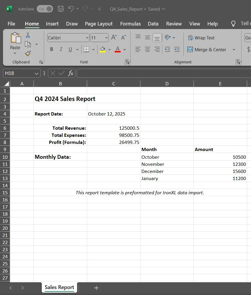 IRONXLの使用 C#でIronXLを使用してExcelデータを既存のExcelファイルテンプレートにエクスポートする方法 カーティス・チャウ 公開日:12月 18, 2025 IronXL をダウンロード NuGet ダウンロード DLL ダウンロード 無料トライアル LLM向けのコピー LLM向けのコピー LLM 用の Markdown としてページをコピーする ChatGPTで開く このページについてChatGPTに質問する ジェミニで開く このページについてGeminiに問い合わせる ジェミニで開く このページについてGeminiに問い合わせる 困惑の中で開く このページについてPerplexityに問い合わせる 共有する Facebook で共有 Xでシェア(Twitter) LinkedIn で共有 URLをコピー 記事をメールで送る Microsoft Excelテンプレートを使用することで、データを動的に入力しながら、書式、数式、およびレイアウトを保持してレポート生成を効率化します。 このチュートリアルでは、IronXLを使用して既存のExcelワークシートテンプレートにデータを効率的にエクスポートする方法を示します。以下の例では、データをExcelテンプレートに書き出し、プロフェッショナルなExcelシート出力を作成する方法を示します。 Microsoft Officeがインストールされていない既存のExcelテンプレートにエクスポートする方法を探しているとします。 その場合、このExcelライブラリは、さまざまなソース(データセットオブジェクトを含む)からデータを挿入できるより高度な機能を備えたクリーンで高性能なソリューションを提供します。 Excelワークブックに加えて、IronXLはXMLファイルなどの他のデータ交換形式ともよく統合し、開発者が構造化データをシステム間でインポート、エクスポート、または変換することを容易にします。 データベースやシステムファイルからExcelにデータを書き込む必要がある場合でも、このライブラリは.NETアプリケーションとのシームレスな統合をサポートします。 How to Export Excel Data to Existing Excel File Templates in C# Using IronXL: Image 1 - IronXL. データエクスポートにExcelテンプレートを使用する理由 Excelテンプレートは、ゼロからスプレッドシートを作成するよりも大きな利点を提供します。 テンプレートはプロフェッショナルな書式、複雑な数式、条件付き書式ルール、検証済みデータ構造を維持します。 組織はしばしば、インボイス、レポート、ダッシュボードのための標準化されたテンプレートを持っており、これらはデータベース、API、またはデータテーブルのようなコレクションオブジェクトから動的データを取り入れつつ、そのデザインを維持しなければなりません。 出力ファイルに条件付き書式やセル書式を適用する場合、テンプレートはXLSX形式で生成されるすべてのドキュメントで一貫性を確保します。 既存のテンプレートをプログラム的に埋めることにより、開発者は膨大な書式作業を節約し、生成されたすべてのドキュメント間で一貫性を保証します。 IronXLは、Officeインストールを必要とせずにXLSX、XLSファイル、XLSM、XLTXテンプレートを含むさまざまなExcel形式をサポートすることで、このプロセスをシームレスにします。 これらの操作のためのソースコードは、どのプロジェクトフォルダにも簡単に実装できる単純明快なものです。 How to Export Excel Data to Existing Excel File Templates in C# Using IronXL: Image 2 - Cross Platform. テンプレート操作のためのIronXLのセットアップ まず、NuGetパッケージマネージャーを通じてIronXLをインストールします。 パッケージマネージャーコンソールを開き、次のコマンドを実行します。 Install-Package IronXL.Excel Install-Package IronXL.Excel SHELL How to Export Excel Data to Existing Excel File Templates in C# Using IronXL: Image 3 - InstallationHow to Export Excel Data to Existing Excel File Templates in C# Using IronXL: Image 3 - Installation インストール後、必要な名前空間をC#ファイルに追加します。 using IronXL; using IronXL; Imports IronXL $vbLabelText $csharpLabel IronXLはMicrosoft Officeのインストールを必要とせずに独立して動作し、サーバー環境やDockerコンテナ、クラウドプラットフォームを含むクロスプラットフォームアプリケーションに理想的です。 詳細なセットアップ手順や追加情報については、IronXLスタートガイドをご覧ください。 このライブラリはWindows、Linux、macOS環境全体で.NET Framework、.NET Core、および.NET 5+をサポートし、.NETアプリケーションに最適です。 How to Export Excel Data to Existing Excel File Templates in C# Using IronXL: Image 4 - Features. Excelテンプレートの読み込みと埋め込み 既存のテンプレートのロードは、IronXLのWorkBook.Load()メソッドで簡単に行えます。 以下の例では、テンプレートを開き、データで埋め込む方法を示し、最初の行をヘッダーとして扱い、列名を効果的に管理します。 // Load the existing Excel template for data import WorkBook workbook = WorkBook.Load("ReportTemplate.xlsx"); WorkSheet sheet = workbook.DefaultWorkSheet; // Populate specific worksheet cells with data sheet["B2"].Value = "Q4 2024 Sales Report"; sheet["C4"].StringValue = DateTime.Now.ToString("MMMM dd, yyyy"); sheet["C6"].DecimalValue = 125000.50m; sheet["C7"].Decim