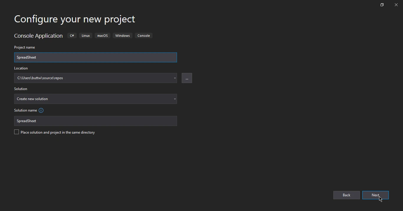 ! Visual Studio の新しいプロジェクト構成ダイアログには、Windows、Linux、macOS、コンソール プラットフォームを対象とする 'SpreadSheet' というコンソール アプリケーションの設定が表示されています。 新しいプロジェクトの構成