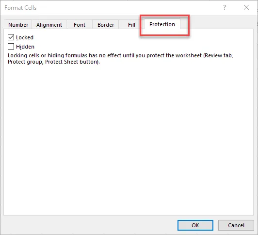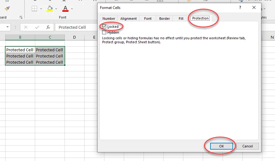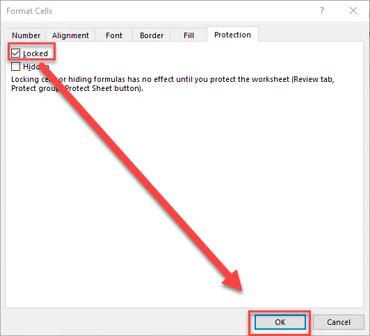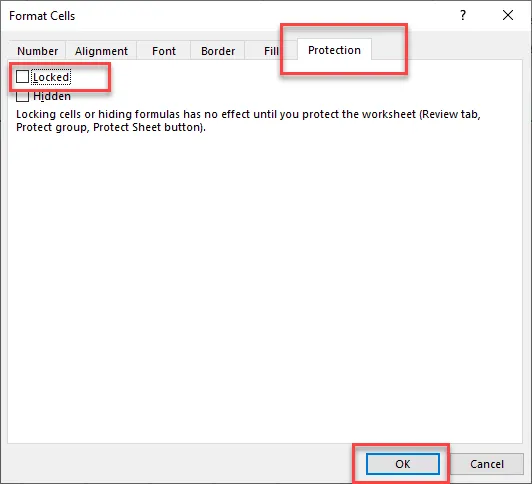保護タブに移動し、「ロック」のオプションのチェックを外し、OKボタンを押します。 これは、Excelスプレッドシートのセルを解除します。