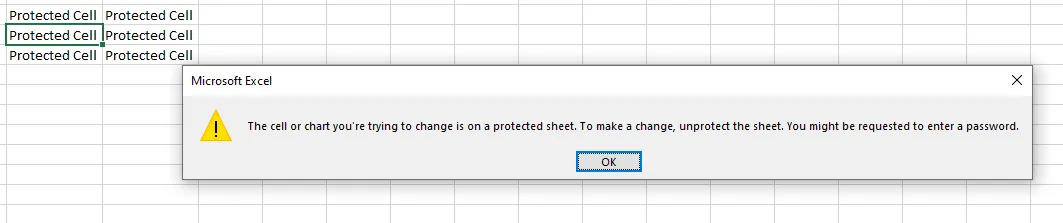 これにより、選択されたセルが保護されます。 これらのセルを編集しようとすると、エラーメッセージが表示されます。
