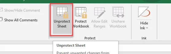 シート全体を選択します。 レビュータブに移動し、「シートの保護解除」をクリックしてください。
