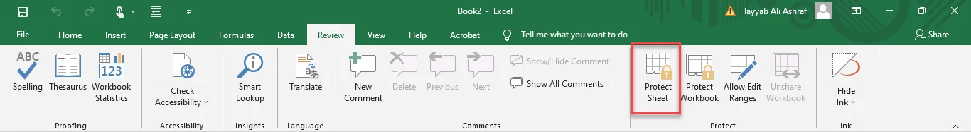 次に、「レビュー」タブに移動し、「保護」グループで「シートの保護」オプションをクリックします。