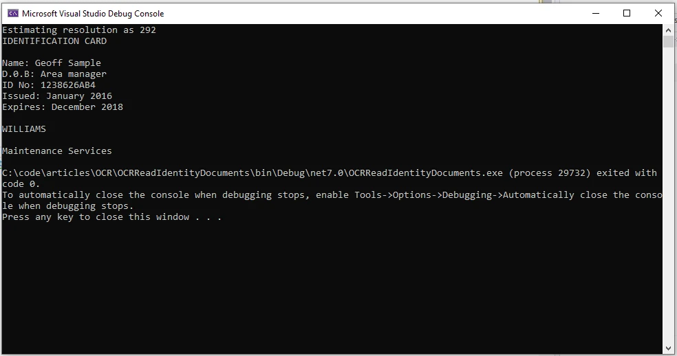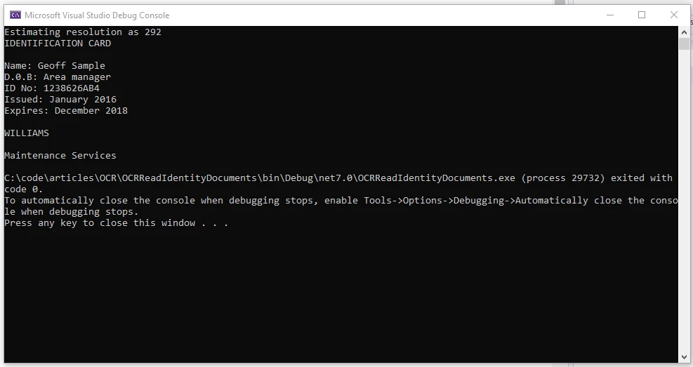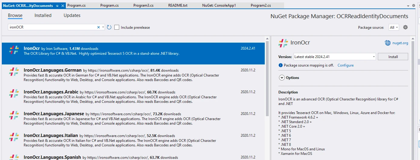 IRONOCRの使い方 C#でOCRを使用して身分証明書を読む方法 Kannapat Udonpant 更新日:6月 22, 2025 IronOCR をダウンロード NuGet ダウンロード DLL ダウンロード Windows 版 無料トライアル LLM向けのコピー LLM向けのコピー LLM 用の Markdown としてページをコピーする ChatGPTで開く このページについてChatGPTに質問する ジェミニで開く このページについてGeminiに問い合わせる ジェミニで開く このページについてGeminiに問い合わせる 困惑の中で開く このページについてPerplexityに問い合わせる 共有する Facebook で共有 Xでシェア(Twitter) LinkedIn で共有 URLをコピー 記事をメールで送る 光学式文字認識 (OCR) 技術は、画像からのテキストの抽出を自動化し、効率的なデータの検索と分析を可能にし、人的エラーを回避するための貴重なツールとなっています。 この技術は、複数の言語と異なる国の運転免許証、パスポート、機関の公式文書、身分証明書、居住許可証、旅行書類を、有効期限、国籍、生年月日などを正確に読み取るために使用できます。抽出されたすべてのデータは、機械学習および人工知能ソフトウェア製品にさらに供給できます。 この記事では、 Iron Softwareの強力な C# OCR ライブラリであるIronOCR を活用して、身分証明書から情報を読み取って抽出する方法について説明します。 IronOCR は、OCR タスク用の API の形で簡単で柔軟な OCR ソリューションを提供するため、OCR ソフトウェア機能をアプリケーションに統合したい開発者にとって最適な選択肢となります。 IronOCR を使用すると、コンピューターが画像からテキストを認識して抽出したり、既存のドキュメントをスキャンしたり、その他のテキストの視覚的表現をスキャンしたりできるようになります。 データを抽出するには、人間がテキストを視覚的に認識して解釈する方法を模倣した一連の複雑なプロセスが必要です。 このプロセスには、画像の前処理、テキスト検出、文字のセグメンテーション、特徴抽出、文字認識、およびエラーを修正するための後処理が含まれます。 C#でOCRを使って身分証明書を読み取る方法 Visual Studioで新しいC#プロジェクトを作成します IronOCR .NET ライブラリをインストールし、プロジェクトに追加します。 IronOCR ライブラリを使用して ID 文書の画像を読み取ります。 PDF から身分証明書を読み取ります。 Iron Software によって作成および保守されている IronOCR は、C# ソフトウェア エンジニア向けの強力なライブラリとして機能し、.NET プロジェクト内での OCR、バーコード スキャン、およびテキスト抽出を容易にします。 IronOCRの主な機能 テキスト読み取りの多様性 画像 (JPEG、PNG、GIFF、TIFF、BMP)、ストリーム、PDF など、さまざまな形式から関連データを読み取ることができます。 画像強調 傾き補正、ノイズ除去、2値化、解像度向上、膨張などのさまざまなフィルターを使用して、低品質のスキャンや写真を修正します。 バーコード認識 20 種類以上のバーコードを含む幅広い形式のバーコードの読み取りをサポートし、QR コード認識も追加されました。 Tesseract OCR統合 画像からテキストを抽出する際のパフォーマンスを最適化するために細かく調整された、Tesseract OCR の最新ビルドを活用します。 柔軟な出力オプション 画像ファイルから検索可能な PDF、HTML、テキスト コンテンツをエクスポートできるため、抽出された情報を柔軟に管理できます。 それでは、IronOCR を使用して ID ドキュメントを読み取るデモ アプリケーションの開発について詳しく見ていきましょう。 前提条件 Visual Studio: Visual Studioまたはその他の C# 開発環境がインストールされていることを確認します。 NuGetパッケージマネージャー: プロジェクトでNuGetを使用してパッケージを管理できることを確認してください。 ステップ1: Visual Studioで新しいC#プロジェクトを作成する まず、Visual Studio で新しい C# コンソール アプリケーションを作成するか、既存のプロジェクトを利用します。 メニューから"新しいプロジェクトの追加"を選択し、下のテンプレートからコンソール アプリケーションを選択します。 ! C#でOCRを使って身分証明書を読み取る方法: 図1 以下のウィンドウでプロジェクト名と場所を入力します。 ! C#でOCRを使って身分証明書を読み取る方法: 図2 ! C#でOCRを使って身分証明書を読み取る方法: 図3 "作成"ボタンをクリックして新しいプロジェクトを作成します。 ステップ 2: IronOCR ライブラリをインストールし、プロジェクトに追加します。 IronOCR はNuGetパッケージ マネージャーにあり、次のコマンドを使用してパッケージ マネージャー コンソールを使用してインストールできます。 Install-Package IronOcr IronOCR は Visual Studio を使用してインストールすることもできます。 NuGet パッケージ マネージャーを開き、以下のように IronOCR を検索して、インストールをクリックします。 ! C#でOCRを使って身分証明書を読み取る方法: 図5 アプリケーションをインストールすると、IronOCR を使用してあらゆ