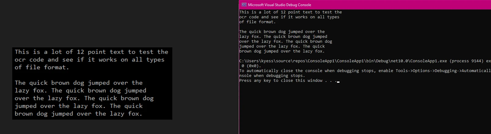 IRONOCRの使い方 C#のOCR CodeProjectチュートリアル:IronOCRで画像からテキストを抽出する Kannapat Udonpant 公開日:12月 11, 2025 IronOCR をダウンロード NuGet ダウンロード DLL ダウンロード Windows 版 無料トライアル LLM向けのコピー LLM向けのコピー LLM 用の Markdown としてページをコピーする ChatGPTで開く このページについてChatGPTに質問する ジェミニで開く このページについてGeminiに問い合わせる ジェミニで開く このページについてGeminiに問い合わせる 困惑の中で開く このページについてPerplexityに問い合わせる 共有する Facebook で共有 Xでシェア(Twitter) LinkedIn で共有 URLをコピー 記事をメールで送る 光学式文字認識(OCR)は、開発者が.NETプロジェクトで文書処理を行う方法を変えます。 スキャン文書、画像ファイル、TIFFファイルのいずれを扱う場合でも、信頼性の高いOCRソリューションを導入することで、アプリケーションはテキストを抽出し、視覚データを機械可読コンテンツに変換することができます。 この記事では、テキスト認識プロセス全体を簡素化する強力なOCRライブラリであるIronOCRを使用して、C# CodeProjectでOCRを使用する方法を紹介します。 IronOCRの無料トライアルを開始し、これらのコードサンプルに従ってください。 私の .NET プロジェクトで OCR ライブラリをセットアップするにはどうすればよいですか? Visual Studioで光学式文字認識(OCR)を設定するには、わずかな手順が必要です。 IronOCRライブラリはNuGet経由で入手可能で、Windowsアプリケーションに簡単に統合できます。 Visual Studioを開き、新しいコンソールアプリケーションプロジェクトを作成します。 ソリューション・エクスプローラーでリファレンスを右クリックし、"Manage NuGet Packages "を選択します。IronOcr "を検索し、パッケージをインストールする。 NuGetパッケージマネージャは、必要なすべてのDLLファイルをダウンロードし、プロジェクトに自動的に参照を追加します。 // Install via Package Manager Console Install-Package IronOCR // Install via Package Manager Console Install-Package IronOCR IRON VB CONVERTER ERROR developers@ironsoftware.com $vbLabelText $csharpLabel インストールしたら、using文を追加してIronOCR名前空間をプログラムにインポートする。 このライブラリは、.NET Framework 4.6.2+と.NET Coreをサポートしており、さまざまなプロジェクトタイプやWindowsバージョンでの互換性を確保しています。 画像ファイルからテキストを抽出するにはどうすればよいですか? OCRプロセスの最初のステップは画像を読み込み、OCRエンジンに通すことです。IronOCRは文字認識操作のための主要なOCR APIとしてIronTesseractクラスを提供しています。 このOCRサンプルは、あらゆる画像ファイルからテキストを抽出するための基本的なアプローチを示しています。 using System; using IronOcr; class Program { static void Main(string[] args) { // Initialize the new Tesseract engine var ocr = new IronTesseract(); // Load the image file and perform OCR using (var input = new OcrInput()) { input.LoadImage(@"sample-document.png"); // Process the image and extract text OcrResult result = ocr.Read(input); // Output the recognized text var text = result.Text; Console.WriteLine(text); } } } using System; using IronOcr; class Program { static void Main(string[] args) { // Initialize the new Tesseract engine var ocr = new IronTesseract(); // Load the image file and perform OCR using (var input = new OcrInput()) { input.LoadImage(@"sample-document.png"); // Process the image and extract text OcrResult result = ocr.Read(input); // Output the recognized text var text = result.Text; Console.WriteLine(text); } } } IRON VB CONVERTER ERROR developers@ironsoftware.com $vbLabelText $csharpLabel 光学式文字認識出力 OCR in C# CodeProject Tutorial:IronOCRで画像からテキストを抽出する: 画像1 - OCR出力のスクリーンショット。 上記のコードは、すべてのテキスト認識操作のためのOCRエンジンとして機能するIronTesseractオブジェクトを作成します。 OcrInputクラスは、PNG、JPEG、BMP、GIF、TIFFなど、さまざまな画像フォーマットを受け入れます。 Readメソッドを呼び出すと、ライブラリは入力画像を処理し、認識されたテキストを含むOcrResultオブジェクトを返します。 OcrResult.Text プロパティは、抽出されたコンテンツをプレーン・テキスト文字列として提供し、アプリケーションでさらに処理できるようにします。 このOCRコードは、複雑な文字認識アルゴリズムを内部で処理し、さまざまなドキュメントタイプにわたって高い精度で認識結果を提供します。 スキャンしたドキュメントや TIFF ファイルを処理するにはどうすればよいですか? 実際のアプリケーションでは、TIFFファイルとして保存された複数ページのスキャン文書を処理する必要があることがよくあります。 OCRライブラリは、開発者が特定のページ範囲を読み込んだり、文書全体を処理したりできるようにすることで、これらのシナリオを効率的に処理します。 このサンプルコードは、マルチフレームTIFF画像を扱う方法を示しています。 using System; using IronOcr; class Program { static void Main(string[] args) { var ocr = new IronTesseract(); using (var input = new OcrInput())