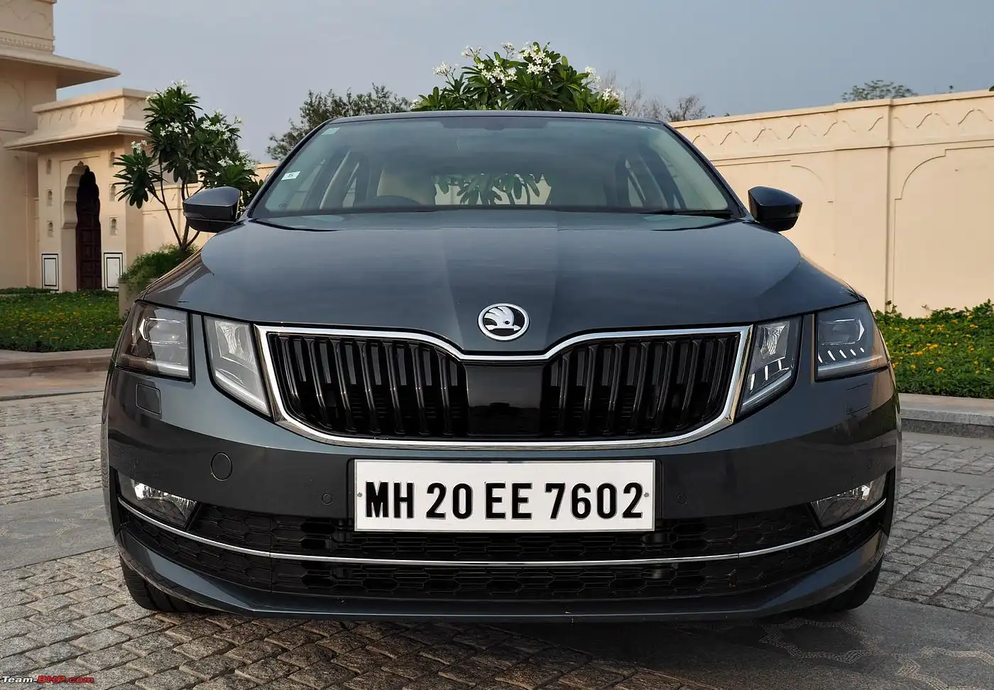 マハラシュトラ州のナンバープレートMH 20 EE 7602を示すダークグレーのシュコダ車がレンガの舗道に駐車。