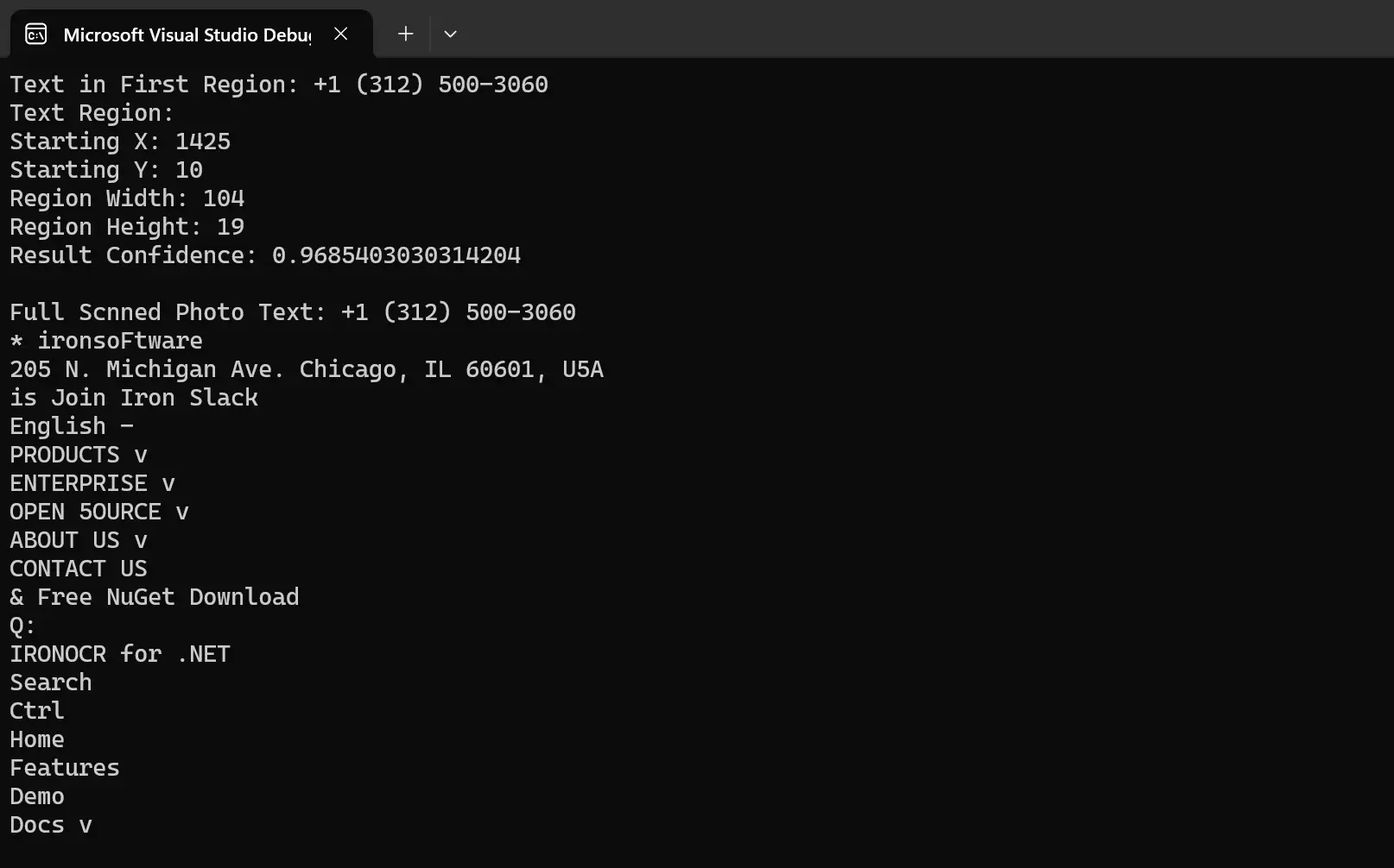 IronOCRのReadPhotoメソッドは、TIFFやGIFのような複雑な写真フォーマットからテキストを抽出し、テキスト領域と信頼度スコアを持つ構造化された結果を提供します。