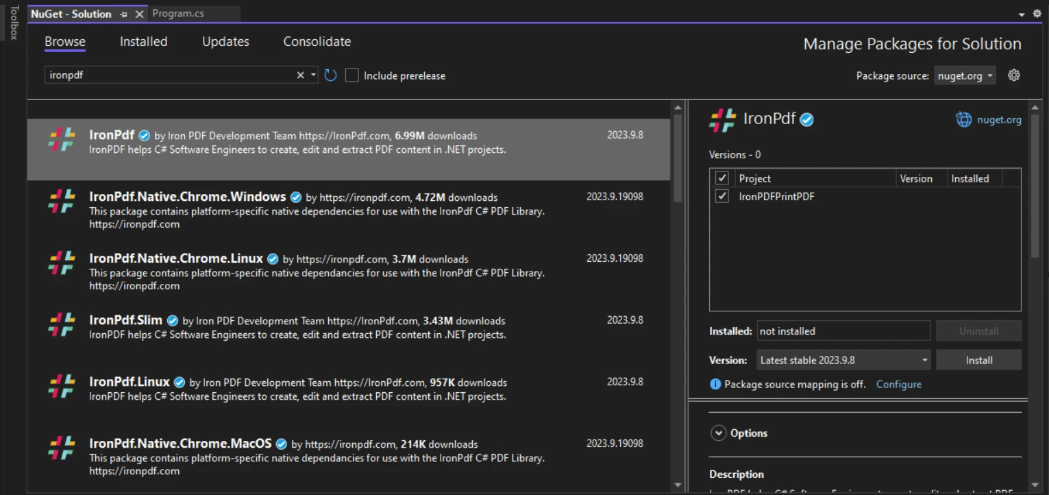 製品比較 PdfiumViewer C#でPDFを印刷(代替チュートリアル) カーティス・チャウ 更新日:8月 20, 2025 IronPrint をダウンロード NuGet ダウンロード 無料トライアル LLM向けのコピー LLM向けのコピー LLM 用の Markdown としてページをコピーする ChatGPTで開く このページについてChatGPTに質問する ジェミニで開く このページについてGeminiに問い合わせる ジェミニで開く このページについてGeminiに問い合わせる 困惑の中で開く このページについてPerplexityに問い合わせる 共有する Facebook で共有 Xでシェア(Twitter) LinkedIn で共有 URLをコピー 記事をメールで送る IronPrintは、Iron Softwareの新しい.NET印刷ライブラリで、Windows、macOS、Android、iOSを含む幅広いプラットフォームで互換性を提供します。今すぐIronPrintを使い始めましょう! PDF ドキュメントは、請求書の作成、レポートの表示、情報の共有など、さまざまなソフトウェア アプリケーションで重要な役割を果たします。 C# で PDF を操作する場合、開発者には複数のオプションがあります。 この記事では、C# で Microsoft Print を使用して PDF を印刷するための 2 つの一般的なライブラリについて説明します。 IronPDF PDFiumビューア それぞれの機能と使いやすさを詳しく調べ、印刷機能を比較して、次の C# プロジェクトで十分な情報に基づいた決定を下せるようにしましょう。 IronPDF IronPDFの概要 IronPDF は、PDF を簡単に作成、操作、処理できるように設計された強力な C# ライブラリです。 幅広い機能を備えているため、開発者の間で好まれる選択肢となっています。 IronPDF は次の機能で優れています: HTML、CSS、画像を PDF ファイルに変換します。 PDF ドキュメントを最初から生成します。 既存の PDF を編集します。 画像、テキスト、表、フォームなどのさまざまな PDF ドキュメント要素をサポートします。 デジタル署名、透かし、暗号化などの高度な機能を提供します。 サードパーティのツールやライブラリを使用せずにサイレント印刷を有効にします。 ユーザーフレンドリーなインターフェースと包括的なドキュメントを提供します。 PDFiumビューア PDFiumビューアの概要 PDFiumViewer は、C# で PDF を操作するためのもう 1 つの一般的なオプションです。 オープンソースの PDFium プロジェクト上に構築されており、その機能用の .NET ラッパーを提供します。 PDFiumViewer は以下を提供します: PDF をレンダリングし、Windows フォーム アプリケーションで表示する機能。 PDF ドキュメント内でのナビゲーション、ズーム、テキスト選択をサポートします。 Windows フォーム プロジェクトのための簡単な統合プロセス。 IronPDFのインストール IronPDF の使用を開始するには、次の手順に従って、Visual Studio の NuGet パッケージ マネージャーを使用してインストールします。 Visual Studio を開き、新しいコンソール アプリケーションを作成するか、既存のコンソール アプリケーションを開きます。 ! PdfiumViewer で C# で PDF を印刷 (代替チュートリアル) 図 1 - 新規プロジェクト - PDFiumViewer で C# で PDF を印刷 ソリューションエクスプローラでプロジェクトを右クリックし、"NuGetパッケージの管理"を選択します。 "参照"タブに切り替えて、"IronPDF"を検索し、"インストール"をクリックします。 ! PdfiumViewer C#でPDFを印刷する(代替チュートリアル)図2 - IronPDFのインストール IronPDF が正常にインストールされると、PDF の印刷やその他の PDF ドキュメント関連のタスクに使用できるようになります。 その前に、システムに PDFiumViewer もインストールしましょう。 PDFiumビューアのインストール PDFiumViewer は NuGet パッケージ マネージャー経由でもインストールできます。 1. Visual Studioを開き、"ツール">"NuGetパッケージマネージャー">"ソリューションのNuGetパッケージの管理"に移動します。 Visual Studio プロジェクトを開き、Windows フォーム アプリケーションを作成します。 ! PdfiumViewer C#でPDFを印刷する(代替チュートリアル)図3 - 新しいプロジェクト ボタンをフォームにドラッグし、"Print PDF"という名前を付けます。 ! PdfiumViewer C#でPDFを印刷する(代替チュートリアル)図4 - 印刷ボタン ソリューション エクスプローラーでプロジェクトを右クリックし、"NuGet パッケージの管理"を選択します。 "NuGet パッケージ マネージャー"ウィンドウで、"参照"タブに切り替えて、"PDFiumViewer"を検索し、"インストール"をクリックします。 ! PdfiumViewer C# で PDF を印刷する (代替チュートリアル) 図 5 - PDFiumViewer のインストール あるいは、PDFium DLL をインストールするには、OS の要件に応じて、"PDFiumViewer.Native"32 ビットまたは 64 ビットを検索します。 この DLL は、Windows フォーム アプリケーションで PDFiumViewer を使用して PDF ファイルまたはページを読み込むために必要です。 ! PdfiumViewer C# で PDF を印刷する (代替チュートリアル) 図 6 - PDFiumViewer.Native インストールが完了すると、PDFiumViewer を使用して PDF ファイルの印刷やその他の PDF 関連のタスクを実行できるようになります。 IronPDFでPDFを