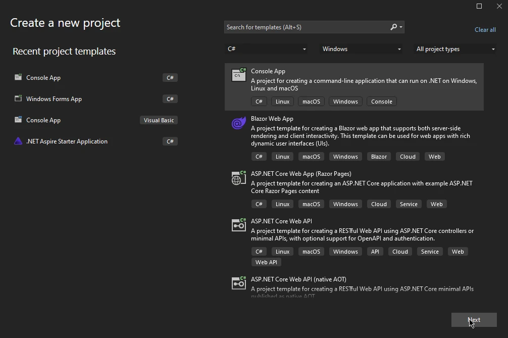 "ファイル">"新規">"プロジェクト"を選択して、新しい .NET プロジェクトを作成します。