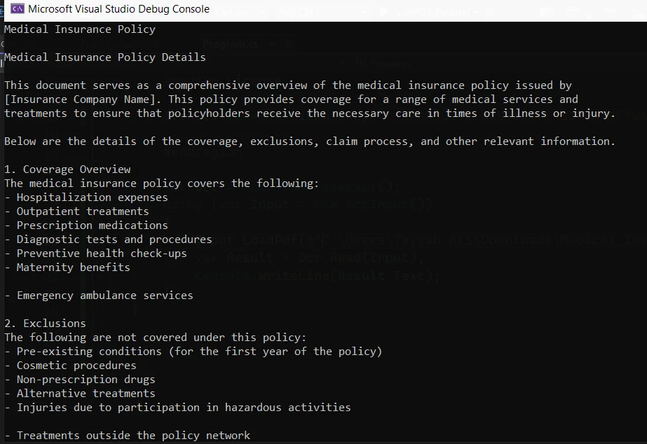 スキャンした保険書類からテキストを抽出するには、 IronOCRを使用します。 以下のコードには、画像ファイルに対して OCR を実行するメソッドが含まれています。
