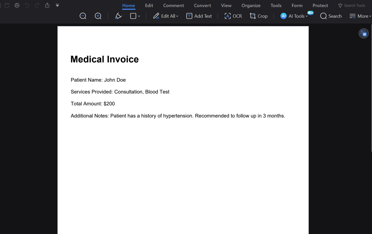 Dim filledHtmlContent As String = htmlTemplate.Replace("{{PatientName}}", "John Doe").Replace("{{Services}}", "Consultation, Blood Test").Replace("{{TotalAmount}}", "$200").Replace("{{AdditionalNotes}}", extractedText)