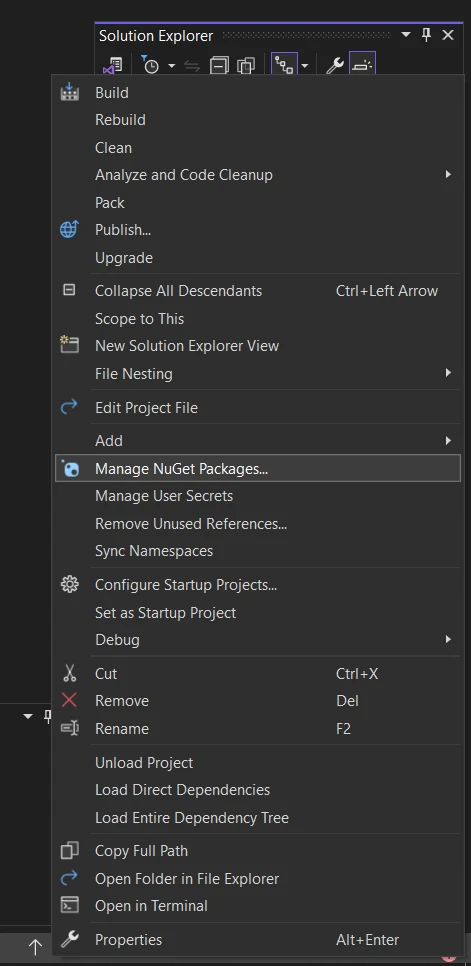 - コンテキスト メニューから"NuGet パッケージの管理..."を選択します。
