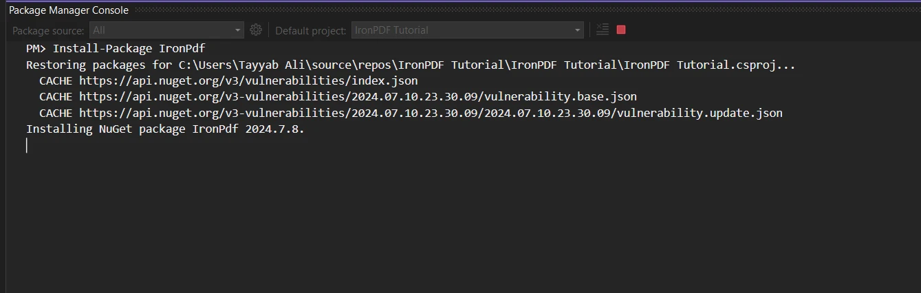 -インストール コマンド (オプション) : または、次のコマンドを使用して、パッケージ マネージャー コンソールから IronPDF をインストールすることもできます。