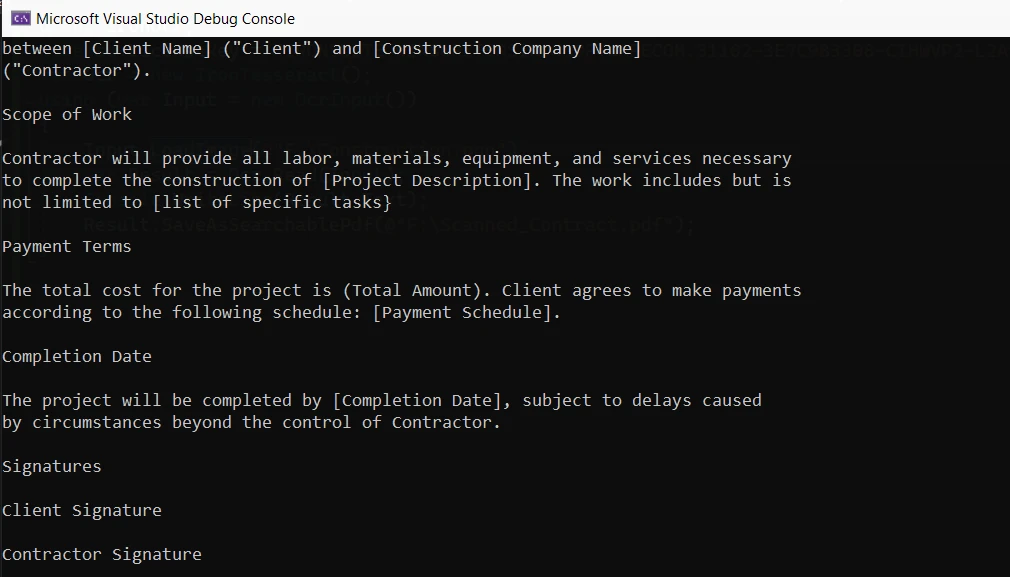 ! C# Iron Suite を使用して建設業界向けの PDF および OCR ソリューションを生成: 図 9 - IronOCR を使用して画像から正確に読み取ったテキストを表示するコンソール出力。