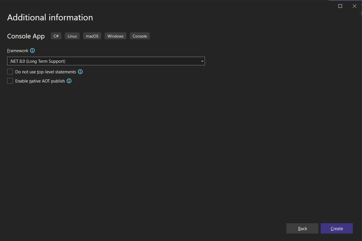 - あなたの要件に合ったプロジェクトテンプレートを選択します(例:コンソールアプリケーション、Windows Formsアプリケーション)。
