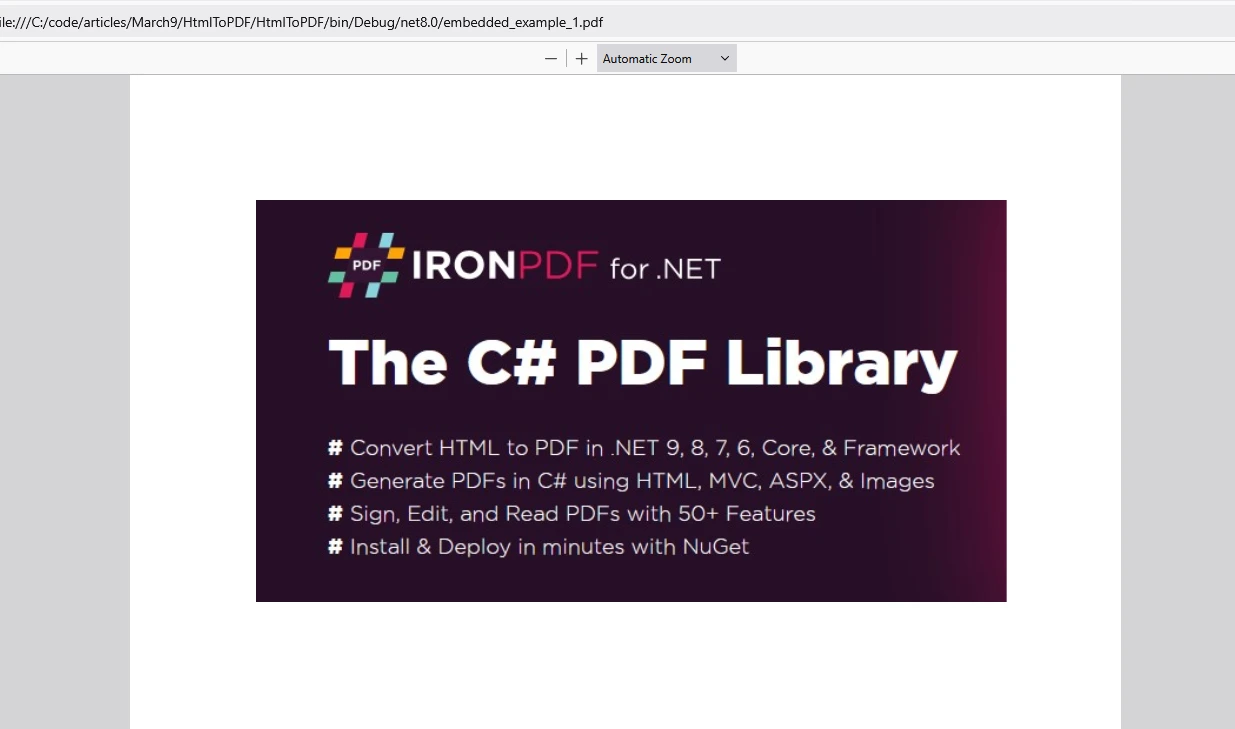 <img>タグ。HTML を PDF にレンダリングする: IronPDF の ChromePdfRenderer を使用して、画像が埋め込まれた HTML を PDF ドキュメントにレンダリングします。
