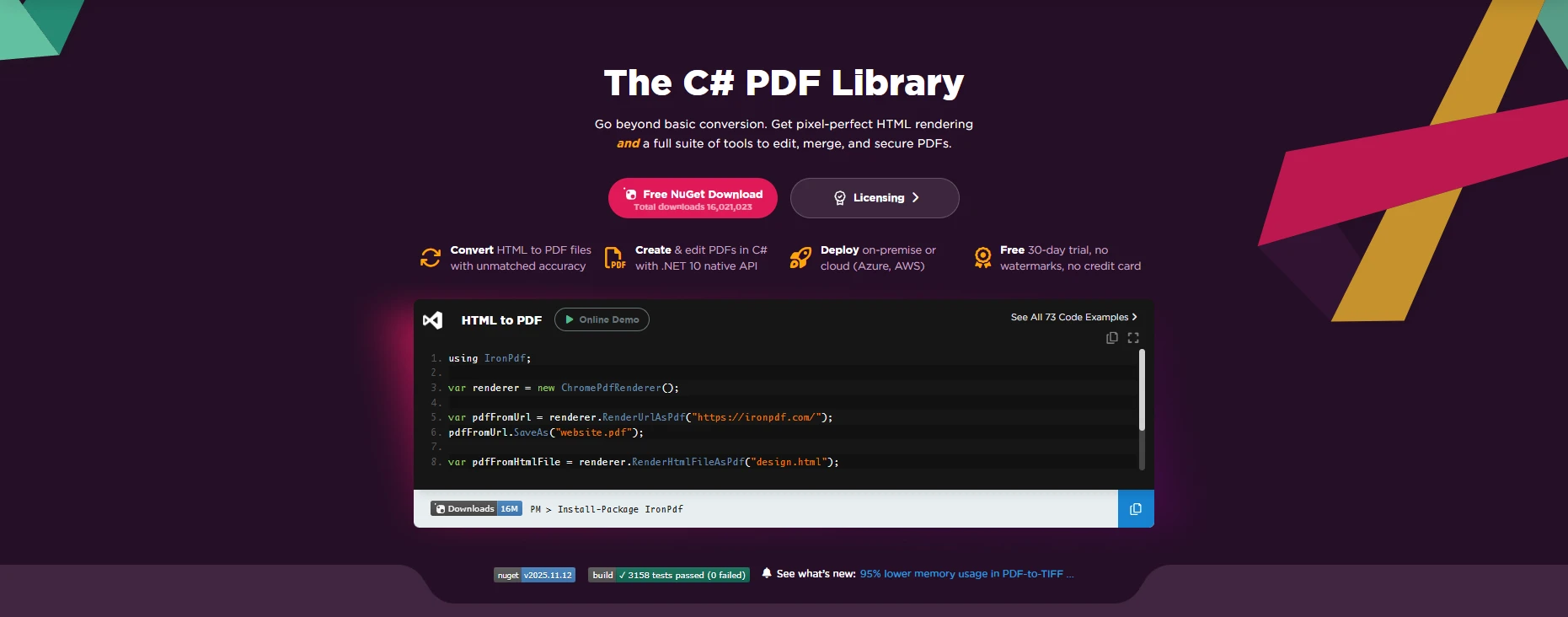 包括的なPDF SDKは、さまざまなファイル形式にわたって、信頼性が高く、忠実度の高い文書生成を提供しなければなりません。 IronPDFはフォント、レイアウト、色空間をレンダリングするための複雑なAPIの代わりに、最新のウェブ技術(HTML)を完全なPDFに変換するための単一の強力なメソッドを使用し、開発者に最終的な出力を完全にコントロールさせます。