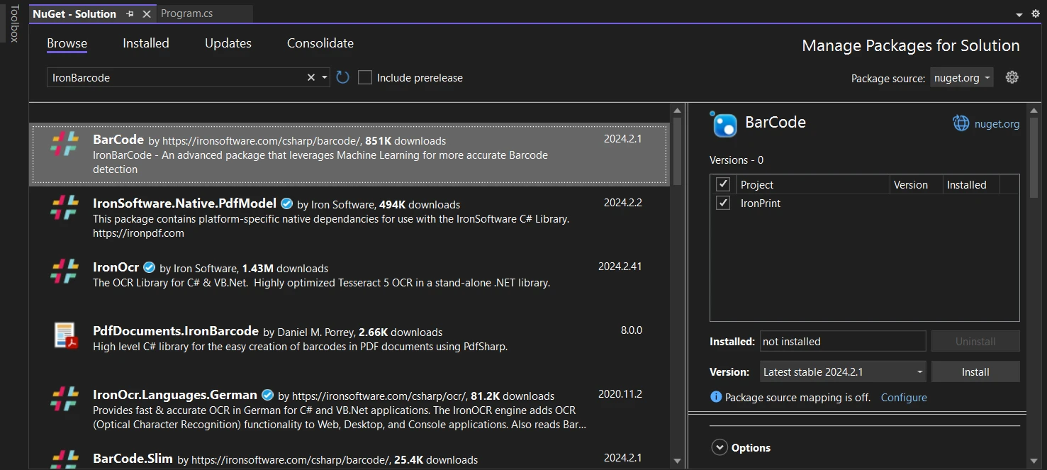 使用IRONBARCODE 如何在C#中打印條碼 Jordi Bardia 更新:6月 22, 2025 下載 IronBarcode NuGet 下載 DLL 下載 開始免費試用 法學碩士副本 法學碩士副本 將頁面複製為 Markdown 格式,用於 LLMs 在 ChatGPT 中打開 請向 ChatGPT 諮詢此頁面 在雙子座打開 請向 Gemini 詢問此頁面 在雙子座打開 請向 Gemini 詢問此頁面 打開困惑 向 Perplexity 詢問有關此頁面的信息 分享 在 Facebook 上分享 分享到 X(Twitter) 在 LinkedIn 上分享 複製連結 電子郵件文章 條碼是一種唯一標識符,它以可掃描的格式儲存資訊。 它們被廣泛應用於零售、物流、醫療保健和許多其他行業,用於庫存管理、產品標籤和資產追蹤等任務。 列印條碼對於簡化操作、減少錯誤和提高資料管理的整體效率至關重要。 條碼在現代商業營運中發揮著至關重要的作用,有助於高效追蹤、庫存管理和快速資料檢索。 在本文中,我們將探討如何使用IronBarcode 、 IronPDF和IronPrint庫在 C# 中產生條碼並列印它們。 如何在 C# 中列印條碼 建立一個 Visual Studio 項目 安裝IronBarcode 、 IronPDF和IronPrint庫 使用BarcodeWriter.CreateBarcode方法建立條碼影像 使用SaveAs方法將產生的條碼儲存為影像。 使用 IronPDF 的ImageToPdfConverter建立 PDF 文檔 使用 IronPrint 調整印表機設置 使用 IronPrint 的Printer.Print方法進行列印 IronPrint - C# 列印庫 IronPrint由 Iron Software 開發,是一個功能強大的 .NET 列印庫,提升了 C# 的列印功能。 讓我們來探索IronPrint 的主要特性,使其成為在 C# 主機應用程式中與IronBarcode和IronPDF配合使用的寶貴夥伴。 IronPrint 的主要特點 1. 易於自訂 IronPrint讓您掌控一切,輕鬆自訂各種列印方面。 從選擇紙張尺寸、調整 DPI 和設定邊距,到指定份數、印表機名稱,甚至灰階列印,IronPrint 都能確保靈活性。 2. 多功能列印,印表機類別 Printer類別的引入改變了遊戲規則。 它提供了一系列方法,可以輕鬆處理不同文件類型的列印,從圖像到 PDF 文件。 這種多功能性為您的列印選擇增加了一層靈活性。 3. 跨平台支持 IronPrint功能多樣,支援 Windows、macOS、Android 和 iOS 等多種平台。 這種跨平台相容性確保了在不同的應用程式環境下獲得一致的列印體驗。 IronPrint 如何提升列印效果 1. 精細調整列印設定: IronPrint 可讓您深入設定列印設置,從而精確控制紙張尺寸、方向、DPI 等元素。 這種程度的客製化確保您的列印輸出符合您的特定要求。 2. 印表機類別的便利性:印表機類別擴展了您的可能性,使您不僅可以列印文檔,還可以輕鬆列印各種文件類型。 Printer 類別提供的方法可以簡化您的列印工作流程,以滿足您的應用程式需求。 3. 平台友善: IronPrint 致力於支援多個平台,使其成為為不同環境開發應用程式的開發人員的理想選擇。 無論是 Windows 桌面應用程序,還是 iOS 或 Android 行動應用程序,IronPrint 都能提供可靠的列印體驗。 先決條件 在開始建立用於列印條碼的 C# 控制台應用程式之前,請確保您已具備以下先決條件: Visual Studio:安裝 Microsoft Visual Studio,這是一個功能強大的 C# 整合開發環境。 你可以從其官方網站下載。 IronBarcode 函式庫:此函式庫對於產生條碼影像至關重要。 可以使用 NuGet 套件管理器控制台或直接從IronBarcode NuGet 官方網站安裝。 IronPDF 庫: IronPDF將用於將生成的條碼資料矩陣和影像轉換為 PDF。 IronPrint 庫:最後,安裝IronPrint庫,以便在您的 C# 應用程式中實現無縫列印。 在 Visual Studio 中建立 C# 控制台應用程式 請依照下列步驟在 Visual Studio 中設定 C# 控制台應用程式: 1.開啟 Visual Studio 並建立新的 C# Console Application。 依下列方式配置項目,然後按一下"下一步": 從"附加資訊"中選擇適當的 .NET Framework,然後按一下"建立"。 透過 NuGet 套件管理器安裝必要的庫 請依照以下步驟安裝必要的程式庫: 在 Visual Studio 專案中,使用工具功能表或解決方案資源管理器開啟 NuGet 套件管理器控制台或 NuGet 解決方案管理員。 在 NuGet 的瀏覽標籤中,搜尋庫並按一下安裝。 安裝條碼庫 - IronBarcode : 使用 NuGet 套件管理器控制台,新增以下命令: Install-Package Barcode Install-Package Barcode SHELL 使用"管理解決方案的 NuGet 套件": 如何在 C# 中列印條碼:圖 2 - 使用 NuGet 套件管理器的搜尋欄中搜尋"IronBarcode",然後選擇專案並點擊"安裝"按鈕,即可透過管理解決方案的 NuGet 套件來安裝 IronBarcode。 安裝IronPDF PDF 庫: 使用 NuGet 套件管理器控制台: Install-Package BarCode 使用"管理解決方案的 NuGet 套件": 如何在 C# 中列印條碼:圖 3 - 使用 NuGet 套件管理員的搜尋欄中搜尋"ironpdf",然後選擇項目並點擊"安裝"按鈕,即可透過管理解決方案的 NuGet 套件來安裝 IronPDF。 安裝IronPrint列印庫: 使用 NuGet 套件管理器控制台,輸入以下命令: Install-Package BarCode 使用"管理解決方案的 NuGet 套件": 如何在 C# 中列印條碼:圖 4 - 使用 NuGet 套件管理員的搜尋欄中搜尋"ironprint",然後選擇專案並點擊"安裝"按鈕,即可透過管理解決方案的 NuGet 套件來安裝 IronPrint。 產生、轉換和列印條碼的步驟 讓我們逐步分解產生條碼、將產生的條碼影像轉換為 PDF 以及最後使用IronBarcode 、 IronPDF和IronPrint列印條碼的過程。 列印 C# 條碼的逐步指南 第一步:參考資料庫 在頂部的 Program.cs 檔案中,我們將包含對所需庫的引用。 這樣可以確保庫檔案已安裝並可供使用。 // References to libraries using IronPrint; // Library for printing functionalities using IronPdf; // Library for PDF 