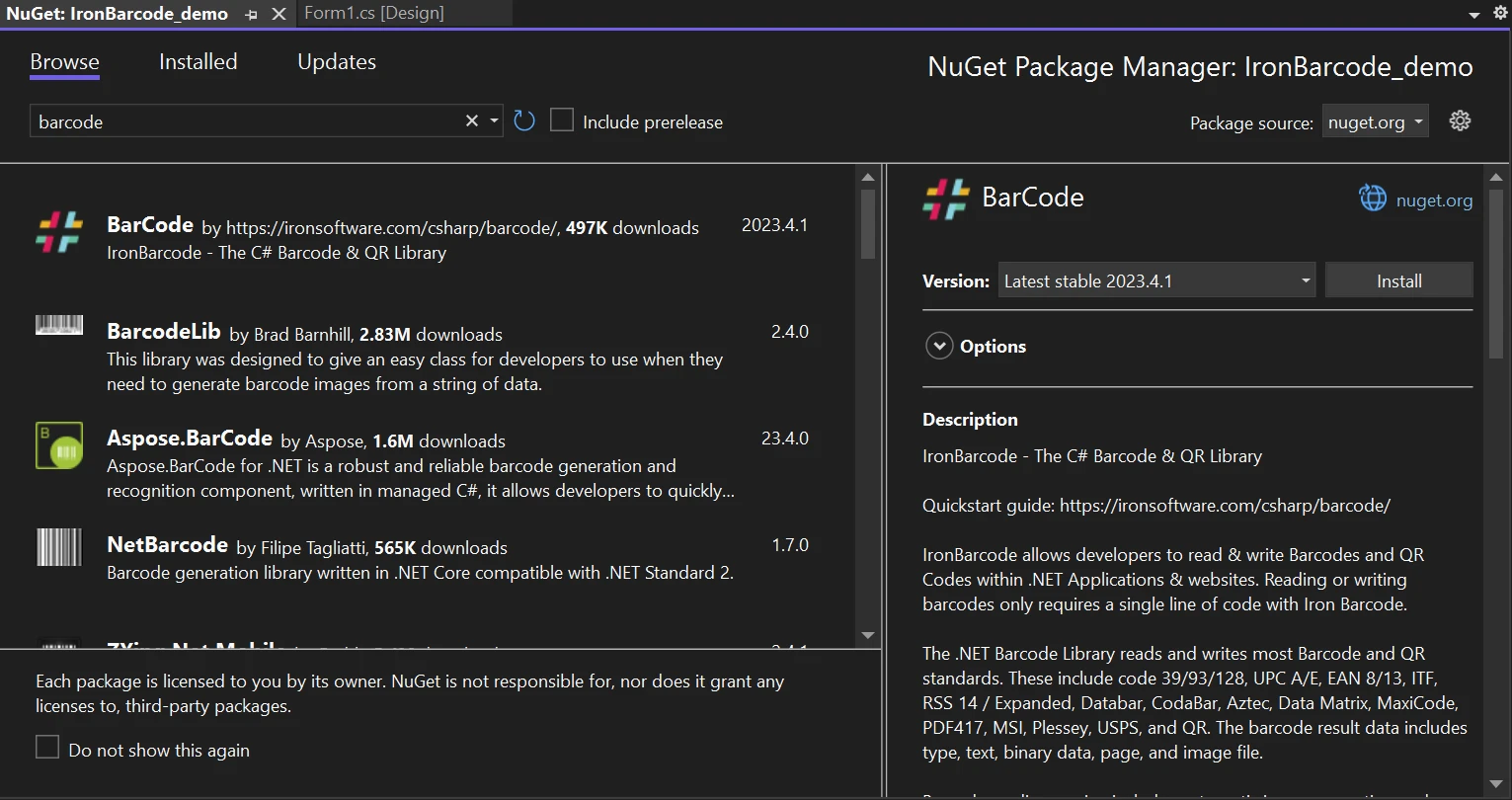 使用IRONBARCODE 如何在C# Windows應用程式中打印條碼 Jordi Bardia 更新:6月 22, 2025 下載 IronBarcode NuGet 下載 DLL 下載 開始免費試用 法學碩士副本 法學碩士副本 將頁面複製為 Markdown 格式,用於 LLMs 在 ChatGPT 中打開 請向 ChatGPT 諮詢此頁面 在雙子座打開 請向 Gemini 詢問此頁面 在雙子座打開 請向 Gemini 詢問此頁面 打開困惑 向 Perplexity 詢問有關此頁面的信息 分享 在 Facebook 上分享 分享到 X(Twitter) 在 LinkedIn 上分享 複製連結 電子郵件文章 1.0 引言 條碼是一種以可見、機器可讀格式呈現資料的途徑。 最初,平行線的間距、寬度和大小各不相同,用來表示條碼中的資料。 這些現代線性或一維 (1D) 條碼可以由稱為條碼閱讀器的專用光學掃描器讀取,條碼閱讀器有多種類型。 後來,出現了二維(2D)變體,稱為矩陣碼或二維條碼,儘管它們實際上並沒有使用條形。 這些變體使用矩形、點、六邊形和其他圖案來代替傳統的條碼。 專為讀取二維條碼而設計的二維光學掃描器有多種配置可供選擇。 另一種讀取二維條碼的方法是使用連接到運行軟體的電腦的數位相機,該軟體拍攝條碼照片並使用該影像對其進行解碼。 後一種形式的二維條碼掃描器可以透過安裝專門的應用軟體,在具有整合攝影機的行動裝置(例如智慧型手機)上使用。 2.0 IronBarcode 功能 使用 IronBarcode 的條碼庫可以輕鬆產生動態條碼。 這個簡單的函式庫只需幾行程式碼即可產生條碼。 IronBarcode 的條碼閱讀器包含強大的條碼產生器,能夠產生高品質的條碼。 這樣條碼掃描器就能輕鬆讀取您的條碼。 IronBarcode 可以讀取和寫入大多數條碼格式和二維碼標準,包括 UPC A/E、Databar、EAN 8/13、MSI、Code 39/93/128、CodaB、RSS 14/Expanded 和 ITF。 IronBarcode 在讀取掃描影像和即時視訊幀時,可以校正旋轉、雜訊、失真和傾斜。 IronBarcode 在產生條碼時,會自動預處理條碼影像,以提高讀取速度和精確度。 動態條碼之所以受歡迎,是因為它們可以修改內容。 IronBarcode 可以利用多個核心和線程,這對批次伺服器來說是有利的。 在單頁和多頁文件中,IronBarcode 可以自動找到一個或多個條碼。 IronBarcode 支援 32 位元和 64 位元架構,並且與 .NET Framework 和 .NET Core 實作相容。 IronBarcode 支援 PC 和行動平台上的控制台、桌面、雲端和線上應用程式。 IronBarcode 可以為各種檔案和串流類型建立條碼影像,包括 PDF、JPG、TIFF、GIF、BMP、PNG 和 HTML。 3.0 在 Visual Studio 中建立新項目 若要使用 IronBarcode 框架,必須先建立一個 Visual Studio .NET 專案。 可以使用任何版本的 Visual Studio,但建議使用最新版本。 根據您的需要,您可以建立 .NET Windows Forms 應用程序,或從各種專案範本中進行選擇。 為了簡化操作,本課我們將使用 Windows 窗體應用程式。 如何在 C# Windows 應用程式中列印條碼 圖 1 - Windows 窗體應用程式 請輸入項目名稱和地點。 如何在 C# Windows 應用程式中列印條碼 圖 2 本專案將使用.NET Framework 4.7。 如何在 C# Windows 應用程式中列印條碼 圖 3 - Form1 應用程式 專案建立完成後,Form1.cs 檔案將在設計器檢視中開啟。 您可以插入程式碼、設計使用者介面,並建置/運行程式。 要在解決方案中使用 IronBarcode 庫,您需要下載所需的軟體包。 這可以透過在程式包管理器控制台中使用以下程式碼來實現: Install-Package BarCode 如何在 C# Windows 應用程式中列印條碼 圖 4 - 安裝條碼包 或者,您可以使用 NuGet 套件管理器搜尋並下載"條碼"包,這將列出所有搜尋結果。 從這裡您可以選擇需要下載的軟體包。 如何在 C# Windows 應用程式中列印條碼 圖 5 - NuGet 套件管理器 我們的表單中放置了一個SaveFileDialog對話框,讓我們可以將產生的條碼影像儲存到選定的位置。 4.0 使用 IronBarcode 產生條碼 IronBarcode 函式庫允許我們只用幾行程式碼快速產生條碼。 以下是使用 Windows 窗體產生條碼標籤的範例程式碼: using IronBarCode; // Import IronBarcode namespace for barcode generation using System; using System.Windows.Forms; // For creating Windows Forms applications namespace IronBarcode_demo { public partial class Form1 : Form { public Form1() { InitializeComponent(); // Initializes the form components } private void button1_Click(object sender, EventArgs e) { try { saveFileDialog1.Filter = ".png|*.png"; // Set file filter for saving as PNG DialogResult result = saveFileDialog1.ShowDialog(); // Show save file dialog if (result == DialogResult.OK) { string filename = saveFileDialog1.FileName; // Get the filename chosen by the user // Create a QR code using data from textBox1, and save it as a PNG QRCodeWriter.CreateQrCode(textBox1.Text, 500, QRCodeWriter.QrErrorCorrectionLevel.Medium, 0).SaveAsPng(filename); MessageBox.Show("Barcode Generated Successfully"); // Inform user of success } } catch (Exception ex) { MessageBox.Show(ex.Message); // Display error message in case of exception } } } } using IronBarCode; // Import IronBarcode namespace for barcode generation using System; using System.Windows.Forms; // For creating Windows Forms applications namespace IronBarcode_demo { public partial class Form1 : Form { public Form1() { InitializeComponent(); // Initializes the form components } private void button1_Click(object sender, EventArgs e) { try { saveFileDialog1.Filter = ".png|*.png"; // Set file filter for saving as PNG DialogResult result = saveFileDialog1.ShowDialog(); // Show save file dialog if (result == DialogResult.OK) { string filename = saveFileDialog1.FileName; // Get the filename chosen by the user // Create a QR code using data from textBox1, and save it