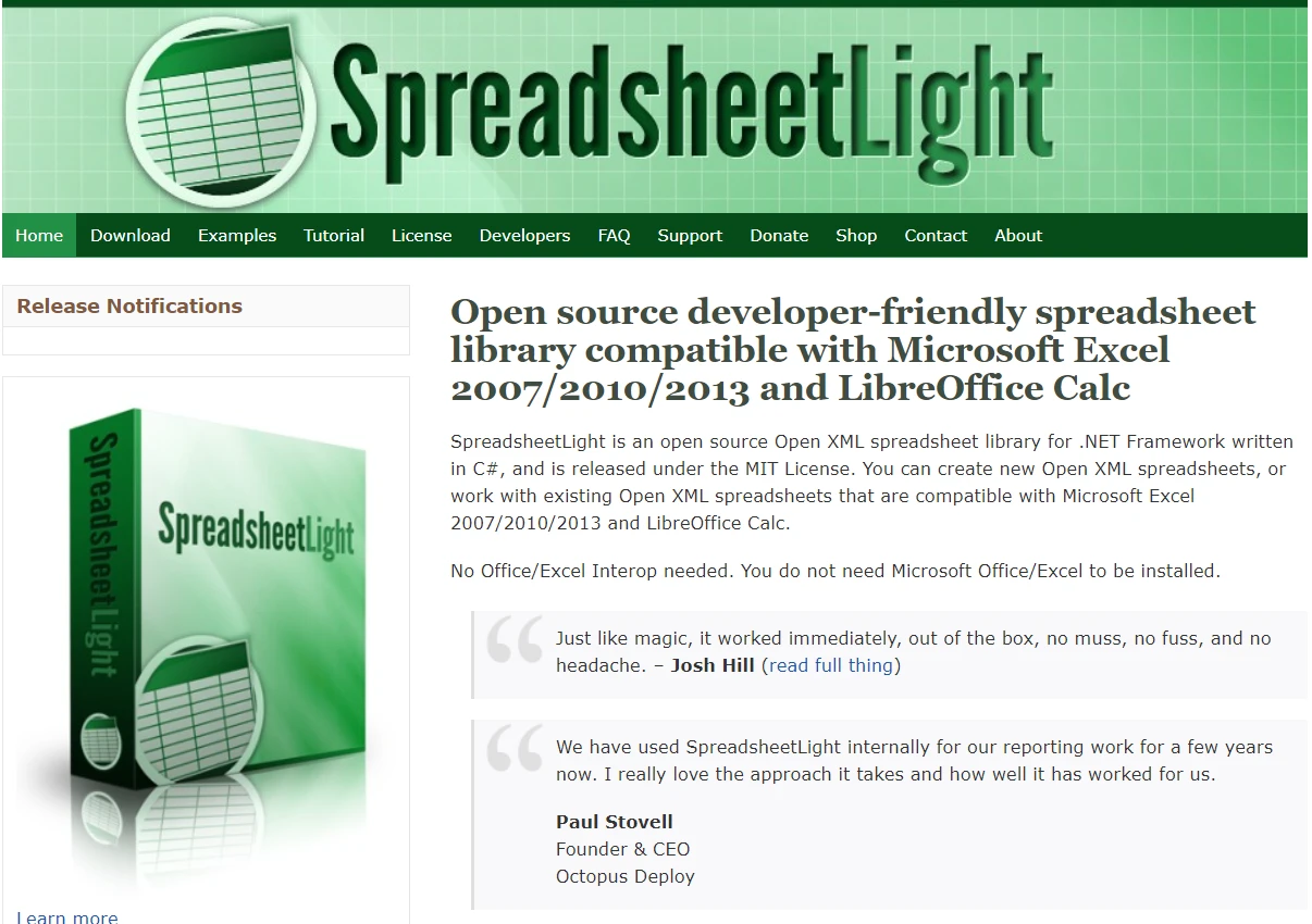 與其他組件的比較 比較三個開放源代碼的 C# Excel 函式庫 Jordi Bardia 更新:7月 28, 2025 下載 IronXL NuGet 下載 DLL 下載 開始免費試用 法學碩士副本 法學碩士副本 將頁面複製為 Markdown 格式,用於 LLMs 在 ChatGPT 中打開 請向 ChatGPT 諮詢此頁面 在雙子座打開 請向 Gemini 詢問此頁面 在雙子座打開 請向 Gemini 詢問此頁面 打開困惑 向 Perplexity 詢問有關此頁面的信息 分享 在 Facebook 上分享 分享到 X(Twitter) 在 LinkedIn 上分享 複製連結 電子郵件文章 正文內容: Excel 檔案在各種商業環境中被廣泛使用,尤其是在資料分析和報告方面。 它們提供了一個多功能的平台,用於組織、儲存和處理資料。 Excel之所以受歡迎,是因為它能夠處理大型資料集、進行複雜計算,並提供多種格式設定選項。 在 .NET 框架中,以程式方式管理電子表格檔案可能具有挑戰性。 關鍵考慮因素包括如何有效率地讀取、寫入和操作 Excel 文件,處理不同的文件格式(如 XLSX 和 CSV),以及如何在不依賴 Microsoft Office 的情況下將 Excel 功能整合到 .NET 應用程式中。 本文將探討三個旨在簡化 .NET 環境中 Excel 檔案操作的 C# 開源 Excel 程式庫。 我們將討論它們的功能,以及使用它們的優點和缺點。 這些圖書館包括: FastExcel 函式庫 Spreadsheet Light NExcel 我們還將討論IronXL ,它是一個強大的 Excel 庫,可用於在 C# 中進行各種複雜的 Excel 操作。 FastExcel:簡化 Excel 文件操作 C# Excel 開源程式庫(比較):圖 1 - FastExcel NuGet 套件頁面 FastExcel是一個開源的 C# .NET 程式庫,旨在有效地讀取和寫入 Excel XLSX 格式的電子表格。 由於記憶體佔用小,它能夠快速處理這些操作,因此表現出色。 這是透過繞過 Open XML SDK 進行資料交互,直接操作 Excel 底層現有的 Open XML 電子表格來實現的。 FastExcel 的主要目標是提供一種輕量級、快速的 Excel 資料互動方法,重點是 Excel 的基本功能。 它並非旨在取代功能更豐富的 Excel 軟體包,後者包含格式設定等進階功能。 不過,它在讀取和寫入 Excel 文件、獲取單元格區域、管理 Excel 表格、行和列、插入文字、新增圖像或新工作表、文件保護和公式計算等操作方面表現出色。 FastExcel 的優點 FastExcel 在快速讀取和寫入 Excel XLSX 電子表格方面表現出色。 這種效率對於需要快速處理大量資料的應用至關重要。 此庫記憶體佔用量小,非常適合對記憶體效率有要求的應用。 它具備高效的資料處理能力,包括對 Excel 檔案進行排序、篩選、合併和複雜計算。 它支援多種操作,例如添加圖像和註釋、管理單元格區域和行、提供 Excel 加密以及公式計算。 FastExcel 的缺點 FastExcel 旨在實現與 Excel 資料的快速交互,但對於需要進階 Excel 功能(如大量格式設定)的場景,可能並非最佳選擇。 它需要 .NET Framework 4.5 或更高版本,這可能會限制其在不支援這些版本的環境中的使用。 電子表格輕量版:輕巧高效 ! C# Excel 開源函式庫(比較):圖 2 - Spreadsheet Light 網頁 Spreadsheet Light是一個高效的免費 C# Excel 庫開源程式庫,它基於強大的 Open XML SDK。 它是為需要在 .NET 應用程式中處理 Excel 文件的開發人員設計的,它是一款輕量級但功能強大的工具。 該程式庫支援 Microsoft Excel 的各個方面,可以有效地操作 Excel 文件格式和 Excel 電子表格。 電子表格輕量版的優點 Spreadsheet Light 與 Microsoft Excel 2007/2010/2013 和 LibreOffice Calc 相容,具有廣泛的使用範圍。 它旨在方便開發人員使用,並簡化了使用 Excel 電子表格的過程。 它在記憶體使用和速度方面都很有效率; 它能夠有效地處理大型資料集。 它支援多種功能,包括條件格式設定、圖表和表格創建,使其適用於各種應用。 它支援各種操作,例如建立新的 Open XML 電子表格、處理 Excel 表格和操作 Excel 工作表,使其成為編寫 Excel 檔案的多功能工具。 它著重降低學習難度和記憶體佔用,對於尋求簡單易用工具的開發人員來說,這是理想的選擇。 電子表格輕量版的缺點 它不支援最新版本的Excel檔案格式。 雖然 Spreadsheet Light 對於大多數任務來說都很高效,但在處理非常大的 Excel 檔案或處理複雜的 VBA 程式碼和條件格式時,它可能會遇到一些限制。 NExcel:輕鬆駕馭 Excel ! C# Excel 開源函式庫(比較):圖 3 - NExcel 網頁 NExcel是一個 C# 開源 Excel 函式庫,它使 .NET 應用程式能夠讀取 Excel 電子表格。 它相容於 Excel 97 及更高版本,並且在 Windows 和 ASP.NET Web 應用程式中都易於使用和部署。 它完全用 C# 編寫,不需要 Microsoft Office Excel 或任何第三方函式庫。 NExcel 支援讀取資料、字型和數字格式設定以及公式等功能。 但是,目前版本僅支援讀取 NExcel 電子表格,不支援寫入,也無法處理包含影像的電子表格。 它需要 Microsoft .NET Framework 1.0 或更高版本才能運作。 NExcel 的優點 NExcel 支援從 Excel 97、2000、XP 和 2003 電子表格中讀取資料。 NExcel 不需要安裝 Microsoft Office Excel 或第三方函式庫,因此它是一個純粹的 .NET 函式庫。 它支援多種語言,包括英語、法語、德語和西班牙語。 NExcel 部署起來非常簡單,只需要將 NExcel.dll 新增到應用程式中即可。 NExcel的缺點 目前版本的 NExcel 只能讀取 Excel 電子表格,不能寫入 Excel 電子表格。 它無法讀取包含圖像的電子表格。 IronXL:一體化 Excel 解決方案 ! C# Excel 開源函式庫(比較):圖 4 - IronXL 網頁 IronXL是一個 .NET Excel 函式庫,專為在 .NET 環境中管理和操作 Excel 檔案而設計。 使用 IronXL,只需幾行程式