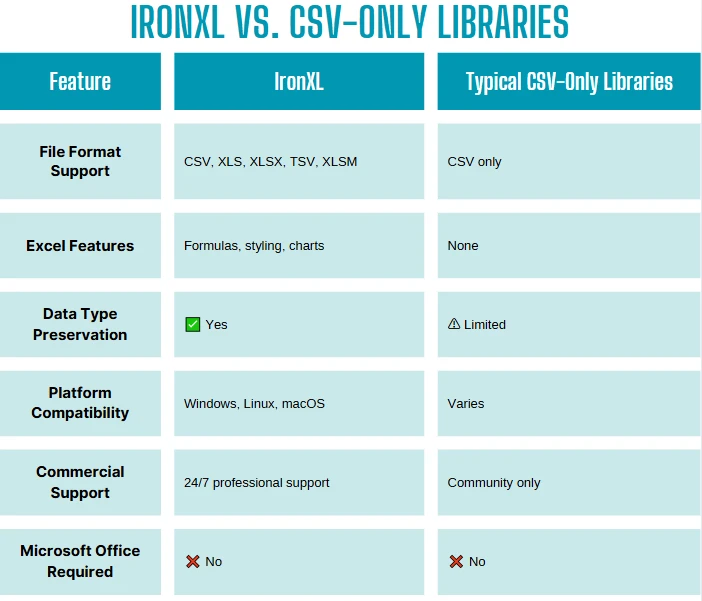 使用 IRONXL 如何使用 C# CSV 函式庫讀寫文件 Jordi Bardia 發表日期:9月 29, 2025 下載 IronXL NuGet 下載 DLL 下載 開始免費試用 法學碩士副本 法學碩士副本 將頁面複製為 Markdown 格式,用於 LLMs 在 ChatGPT 中打開 請向 ChatGPT 諮詢此頁面 在雙子座打開 請向 Gemini 詢問此頁面 在雙子座打開 請向 Gemini 詢問此頁面 打開困惑 向 Perplexity 詢問有關此頁面的信息 分享 在 Facebook 上分享 分享到 X(Twitter) 在 LinkedIn 上分享 複製連結 電子郵件文章 在 C# 中處理 CSV 檔案通常不僅僅是簡單的讀取和寫入。 開發人員需要可靠的 CSV 文件處理、流暢的資料匯入/匯出以及與電子表格工作流程的輕鬆整合。 雖然像 CsvHelper 這樣的免費庫涵蓋了基本的 CSV 操作,但當您需要 Excel 工作簿支援、高效能或對行、列和資料類型的一致處理時,它們有時會顯得力不從心。 IronXL透過提供一個能夠無縫處理 CSV 和 Excel 格式的單一 .NET 程式庫來解決這些難題,而無需 Microsoft Office。它提供了強大的 CSV 讀寫功能、自訂類別物件映射功能以及逗號分隔值和 Excel 之間的轉換功能。 所有這些都以高效能、低記憶體的工作流程實現,適用於桌面和 Web 應用程式。 如何開始使用 IronXL? 透過NuGet 套件管理器安裝 IronXL 只需幾秒鐘。 在 Visual Studio 中開啟程式包管理器控制台並執行: Install-Package IronXL.Excel 安裝完成後,將 IronXL 命名空間新增至您的 C# 檔案: using IronXL; using IronXL; Imports IronXL $vbLabelText $csharpLabel IronXL 可在 Windows、Linux 和 macOS 環境下執行,支援 .NET Framework 4.6.2+ 和 .NET Core/5/6/7/8+。 該程式庫無需依賴 Microsoft Office 即可獨立運行,因此非常適合伺服器部署和雲端應用程式。 有關詳細的安裝說明,請造訪IronXL 安裝指南。 如何使用 IronXL 讀取 CSV 檔案? IronXL 支援輕鬆讀取 CSV 文件,整個過程遵循直觀的模式。 該程式庫會自動處理編碼偵測和分隔符號識別等常見挑戰,這些問題是開發人員在解析 CSV 資料時經常遇到的: // Load a CSV file into a WorkBook WorkBook workBook = WorkBook.Load("sales_data.csv"); // Access the imported worksheet WorkSheet workSheet = workBook.DefaultWorkSheet; // Read specific cell values string customerName = workSheet["A2"].StringValue; decimal orderAmount = workSheet["B2"].DecimalValue; // iterating from row 1 to skip the header row for (int i = 1; i < workSheet.Rows.Count(); i++) { var row = workSheet.Rows[i]; Console.WriteLine($"Customer: {row.Columns[0].Value}, Amount: {row.Columns[1].Value}"); } // Load a CSV file into a WorkBook WorkBook workBook = WorkBook.Load("sales_data.csv"); // Access the imported worksheet WorkSheet workSheet = workBook.DefaultWorkSheet; // Read specific cell values string customerName = workSheet["A2"].StringValue; decimal orderAmount = workSheet["B2"].DecimalValue; // iterating from row 1 to skip the header row for (int i = 1; i < workSheet.Rows.Count(); i++) { var row = workSheet.Rows[i]; Console.WriteLine($"Customer: {row.Columns[0].Value}, Amount: {row.Columns[1].Value}"); } IRON VB CONVERTER ERROR developers@ironsoftware.com $vbLabelText $csharpLabel 這段程式碼將 CSV 檔案載入到 WorkBook 物件中,從而提供完整的電子表格功能。 DefaultWorkSheet 屬性可直接存取 CSV 資料。 可以使用熟悉的 Excel 表示法(例如"A2")存取單一儲存格,內建的類型轉換方法(StringValue、DecimalValue、IntValue)可確保正確的資料處理。 for 迴圈示範了行迭代,將每一行視為單元格的集合。 我們使用了一個循環,它會自動跳過第一行,因為它是標題行; 但是,如果您想將標題保留在輸出中,只需使用: foreach (var row in workSheet.Rows) { Console.WriteLine($"{row.Columns[0].Value}, {row.Columns[1].Value}"); } foreach (var row in workSheet.Rows) { Console.WriteLine($"{row.Columns[0].Value}, {row.Columns[1].Value}"); } IRON VB CONVERTER ERROR developers@ironsoftware.com $vbLabelText $csharpLabel 對於更複雜的場景,請查閱完整的閱讀教學。 輸出 如何使用 C# CSV 庫讀寫檔案:圖 1 - 讀取 CSV 檔案輸出 對於進階場景,開發人員可以透過遍歷每一行並將單元格值指派給物件屬性,將 CSV 行對應到自訂類別物件。 這種方法為在 C# 中處理結構化資料提供了一種簡潔的方式。 如何在C#中寫入CSV檔案? 使用 IronXL 建立 CSV 檔案支援多種方法,從建立新的電子表格到轉換現有資料結構。 這種靈活性使其成為資料匯出場景的理想選擇: // Create a new workbook WorkBook workBook = WorkBook.Create(); WorkSheet workSheet = workBook.CreateWorkSheet("inventory"); // Add header row workSheet["A1"].Value = "Product"; workSheet["B1"].Value = "Quantity"; workSheet["C1"].Value = "Price"; // Add data rows workSheet["A2"].Value = "Widget"; workSheet["B2"].Value = 100; workSheet["C2"].Value = 19.99; // Save as CSV workBook.SaveAsCsv("inventory.csv"); // Create a new workbook WorkBook workBook = WorkBook.Create(); WorkSheet workSheet = workBook.CreateWorkSheet("inventory"); // Add header row workSheet["A1"].Value = "Product"; workSheet["B1"].Value = "Quantity"; workSheet["C1"].Value = "Price"; // Add data rows workSheet["A2"].Value = "Widget"; workSheet["B2"].Value = 100; workSheet["C2"].Value = 19.99; // Save as CSV workBook.SaveAsCsv("inventory.csv"); IRON VB CONVERTER ERROR developers@ironsoftware.com $vbLabelText $csharpLabel 本範例從頭開始建立一個新的工作簿,並向其中填入資料。 SaveAsCsv() 方法將工作表匯出為 CSV 格式,自動處理正確的格式和分隔符號。 IronXL 在匯出過程中保留資料類型,確保數字保持數值形式,而不是將所有內容轉換為字串。 SaveAsCsv 方法支援在需要時使用自訂分隔符號。 輸出 如何使用 C# CSV 庫讀寫文件:圖 2 - 使用 