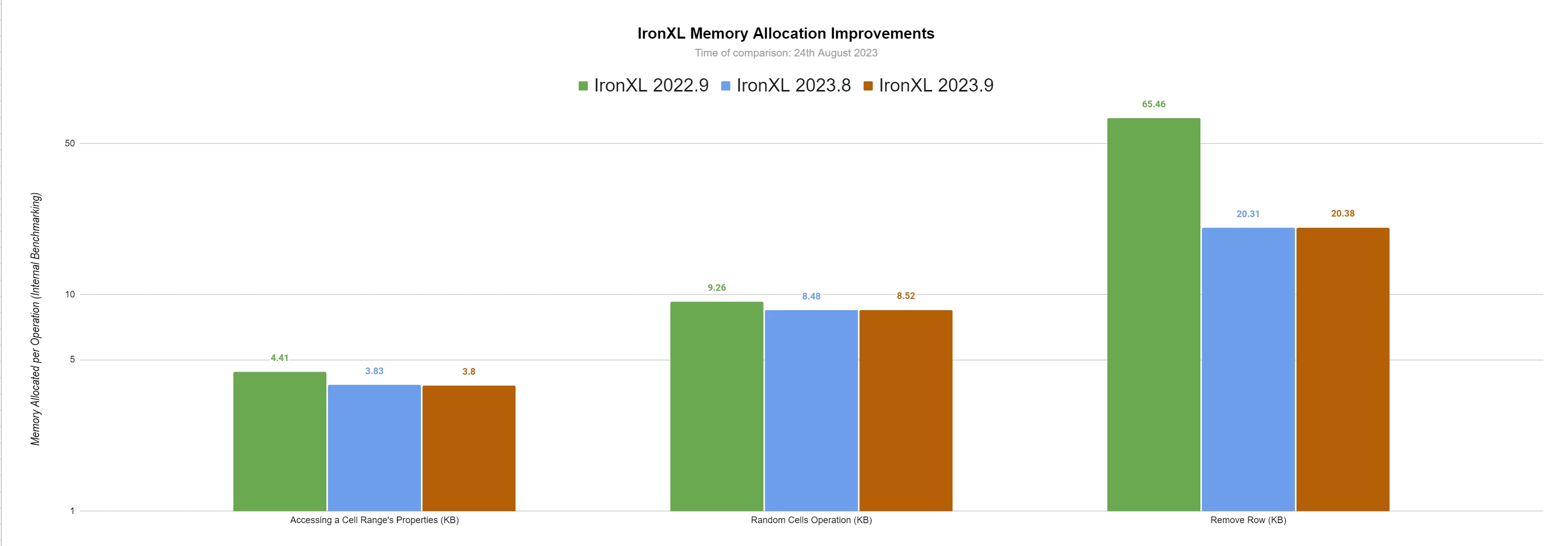 IronXL 里程碑:穩定性和性能 IronXL里程碑:效能與記憶體大幅提升 Curtis Chau 更新:2025年6月1日 下載 IronXL NuGet 下載 DLL 下載 開始免費試用 法學碩士副本 法學碩士副本 將頁面複製為 Markdown 格式,用於 LLMs 在 ChatGPT 中打開 請向 ChatGPT 諮詢此頁面 在雙子座打開 請向 Gemini 詢問此頁面 在 Grok 中打開 向 Grok 詢問此頁面 打開困惑 向 Perplexity 詢問有關此頁面的信息 分享 在 Facebook 上分享 分享到 X(Twitter) 在 LinkedIn 上分享 複製連結 電子郵件文章 This article was translated from English: Does it need improvement? Translated View the article in English *更新*:IronXL 效能改進 主要優勢:提高營運速度,實現新的效率。 次要好處:記憶體分配得到改善。 出貨日期**:2023年9月 截至我們最新的 2023 年 9 月版本 (2023.9.29) 發佈時,IronXL 的 NuGet 安裝量已超過 50 萬次,我們回顧了我們的開發團隊在過去一年中取得的所有成就和更新,使 IronXL 成為 .NET Excel 文件庫市場的領先產品。 "即使在我的低配置電腦上,我也需要更快的 IronXL!" IronXL性能提升 IronXL 在運行速度和內存方面都取得了巨大的進步。 在本節中,我們將把 IronXL 與一年前的 9 月(2022.9)以及上個月的 8 月(2023.8)進行比較。 IronXL 2023.9 版本(最新版)比較 IronXL 2023.8 版本(上個月版)比較 IronXL 2022.9 版本(去年版) 圖 0 從下圖可以看出,許多指標都在進行比較:根據所有指標,IronXL 與去年同期相比均有所改善。 競爭對手比較 IronXL 2023.9 版本 圖 1 圖 2 圖 3 圖 4 IronXL記憶體分配改進 IronXL 在運行記憶體使用方面取得了巨大的進步。 這是一個重要的進步,它確保新版本的 IronXL 將使用更少的內存,從而在不更改程式碼的情況下節省生產時間和金錢。 在本節中,我們將把 IronXL 與一年前的 9 月(2022.9)以及上個月的 8 月(2023.8)進行比較。 圖 5 下圖比較了三個指標: 存取單元格區域的屬性 同樣的操作,記憶體使用量從 4.41 千位元組減少到 3.8 千字節,比前一年提高了 14%! 隨機單元格操作 同樣的操作,記憶體使用量從 9.26 千位元組減少到約 8.5 千字節,比前一年提高了 8%! 移除大行操作 同樣的操作,記憶體使用量從 65.46 千位元組減少到約 20.3 千字節,比前一年提高了 69%! 請注意 Y 軸上的對數刻度,因為這低估了我們將這項操作減少了三分之二的事實。 使用常規的 Y 軸,我們可以看到這 69% 的改進: 圖 6 下面我們也將比較規模更大的業務: 圖 7 下圖比較了三個指標: 資料單元操作 同樣的操作,記憶體使用量從 676.81 千位元組減少到 669.91 千字節,比前一年提高了 2%! 考慮到每次編輯 Excel 文件時都會出現許多這樣的情況,這確實意義重大。 儲存大文件 同樣的操作,記憶體使用量從約 1028 兆位元組減少到約 838 兆位元組,與去年同期和去年同期相比,記憶體使用量均提高了 18%! IronXL里程碑:性能提升 準備好開始了嗎? Nuget 下載 1,846,091 | 版本: 2026.2 剛剛發布 免費 NuGet 下載 總下載量:1,846,091 查看許可證