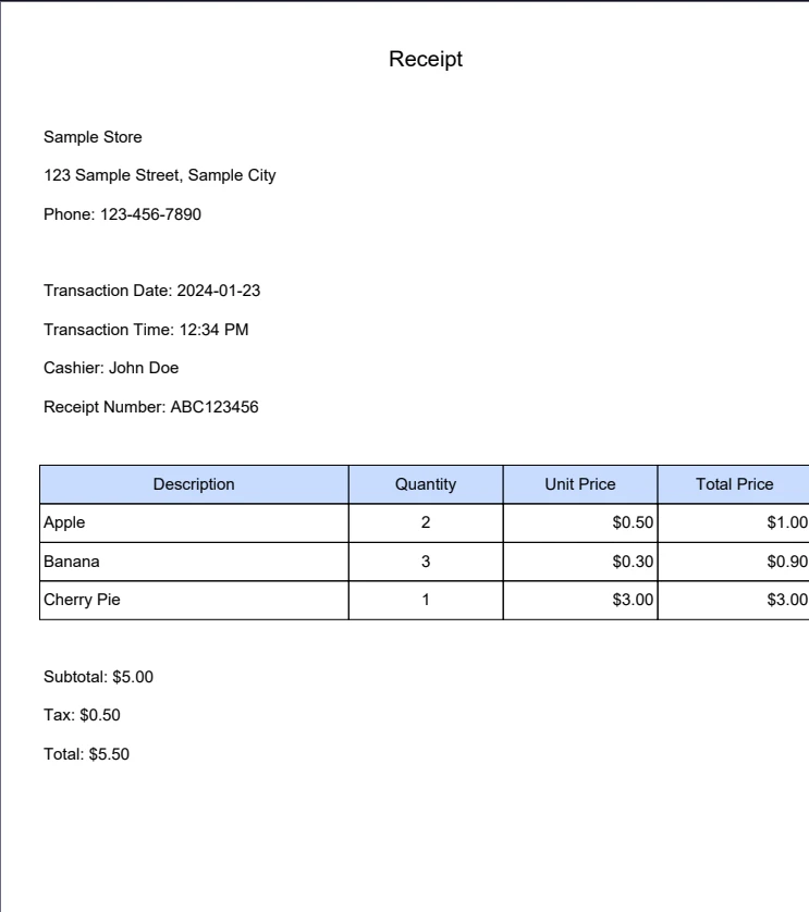使用 IRONOCR 如何在 C# 中創建 OCR 收據掃描儀 Kannapat Udonpant 更新:6月 22, 2025 下載 IronOCR NuGet 下載 DLL 下載 Windows 安裝程式 開始免費試用 法學碩士副本 法學碩士副本 將頁面複製為 Markdown 格式,用於 LLMs 在 ChatGPT 中打開 請向 ChatGPT 諮詢此頁面 在雙子座打開 請向 Gemini 詢問此頁面 在雙子座打開 請向 Gemini 詢問此頁面 打開困惑 向 Perplexity 詢問有關此頁面的信息 分享 在 Facebook 上分享 分享到 X(Twitter) 在 LinkedIn 上分享 複製連結 電子郵件文章 本教學課程旨在協助初學者使用IronOCR (C# 中的 OCR API)建立OCR 收據掃描器。 在本指南結束時,您將了解如何使用收據 OCR API 實現光學字元辨識 (OCR),將不同類型的收據檔案轉換為可編輯且可搜尋的資料。 對於希望實現費用管理自動化和最大限度減少人工資料輸入的企業來說,這項技術可以帶來改變。 讓我們開始吧 如何在 C# 中建立 OCR 收據掃描器 在 Visual Studio 中建立一個 C# 控制台專案。 使用 NuGet 套件管理器安裝 OCR 庫。 使用OcrInput方法將收據載入到程式中。 使用Read方法提取文字。 在控制台上顯示提取的文字。 先決條件 在開始編寫程式碼之前,請確保您已準備好以下物品: Visual Studio :這將是我們的整合開發環境 (IDE),我們將在其中編寫和運行我們的 C# 程式碼。 IronOCR 庫:我們將使用 IronOCR,這是一個高級的 OCR 庫,可以輕鬆整合到 C# 應用程式中。 3.收據樣本:一個名為Sample_Receipt.jpg的收據圖像文件,我們將使用它來測試我們的OCR 實作。 如何在 C# 中建立 OCR 收據掃描器:圖 1 - 收據範例圖片 步驟 1:項目設定 開啟 Visual Studio :在桌面或應用程式選單中找到 Visual Studio 圖標,雙擊即可開啟該程式。 建立新專案:Visual Studio 開啟後,你會看到一個啟動視窗。 點擊"建立新項目"按鈕。 如果您已經開啟了 Visual Studio 但沒有看到啟動窗口,可以透過點擊頂部選單中的"檔案">"新建">"專案"來存取它。 選擇項目類型:在"建立新項目"視窗中,您將看到各種項目範本。 在搜尋框中,鍵入"控制台應用程式"以篩選選項,然後根據您的偏好和相容性選擇控制台應用程式 (.NET Core) 或控制台應用程式 (.NET Framework)。 然後點擊"下一步"按鈕。 設定您的新專案:現在,您將看到一個名為"配置您的新專案"的畫面。 在"專案名稱"欄位中,輸入OCRReceiptScanner作為您的專案名稱。 在位置欄位中選擇或確認項目的儲存位置。 (可選)如果您希望解決方案名稱與專案名稱不同,也可以指定解決方案名稱。 填寫完這些資訊後,點擊"下一步"按鈕。 補充資訊:系統可能會要求您選擇目標 .NET Framework。 選擇最新版本(除非您有特定的相容性要求),然後按一下"建立" 。 步驟 2:整合 IronOCR 在使用 IronOCR 庫之前,我們需要將其包含到我們的專案中。 請遵循以下步驟: 在解決方案資源管理器中以滑鼠右鍵按一下您的專案。 選擇"管理 NuGet 套件"。 在 NuGet 套件管理員視窗中,您會看到幾個選項卡,例如"瀏覽"、 "已安裝" 、 "更新"和"合併" 。 點選"瀏覽"標籤。 在搜尋框中,輸入IronOcr 。 這是我們希望添加到專案中的庫的名稱。 按下回車鍵搜尋。 搜尋結果將顯示 IronOCR 庫包。 它應該是你最先看到的結果之一。 按一下以選取。 選擇 IronOCR 軟體包後,您會在右側看到一個面板,其中顯示了該軟體包的信息,包括其描述和版本。 此面板中還有一個"安裝"按鈕。 如何在 C# 中建立 OCR 收據掃描器:圖 2 - 透過 NuGet 套件管理器安裝 IronOCR 點選"安裝"按鈕。 此操作可能會提示您查看更改,並可能顯示將與 IronOcr 一起包含的依賴項清單。 檢查變更和依賴項,如果一切看起來都正確,請確認並繼續安裝。 步驟 3:設定項目 安裝 IronOCR 後,下一步是配置您的專案。 方法如下 新增命名空間:在Program.cs檔案的頂部,包含以下命名空間: using IronOcr; using System; using IronOcr; using System; Imports IronOcr Imports System $vbLabelText $csharpLabel 配置設定:如果您有任何配置設置,例如 API 金鑰或許可證金鑰,請務必將其包含在內。 對於 IronOCR,您需要按照提供的代碼所示設定許可證金鑰: License.LicenseKey = "License-Key"; // replace 'License-Key' with your key License.LicenseKey = "License-Key"; // replace 'License-Key' with your key License.LicenseKey = "License-Key" ' replace 'License-Key' with your key $vbLabelText $csharpLabel 第四步:閱讀收據 現在,讓我們來編寫讀取收據的程式碼。 定義收據路徑:指定要掃描的收據檔案的路徑。 string pdfFilePath = "Sample_Receipt.jpg"; string pdfFilePath = "Sample_Receipt.jpg"; Dim pdfFilePath As String = "Sample_Receipt.jpg" $vbLabelText $csharpLabel try-catch 區塊:使用 try-catch 區塊實作錯誤處理。 這將有助於您管理 OCR 過程中出現的任何異常情況。 try { // OCR code will go here } catch (Exception ex) { // Handle exceptions here Console.WriteLine($"An error occurred: {ex.Message}"); } try { // OCR code will go here } catch (Exception ex) { // Handle exceptions here Console.WriteLine($"An error occurred: {ex.Message}"); } Try ' OCR code will go here Catch ex As Exception ' Handle exceptions here Console.WriteLine($"An error occurred: {ex.Message}") End Try $vbLabelText $csharpLabel 第五步:實施OCR 在步驟 5 中,我們將深入研究應用程式的核心功能:實作 OCR 以讀取和解釋收據中的資料。 這包括初始化 OCR 引擎、設定輸入、執行 OCR 操作和顯示結果。 初始化 IronTesseract 程式碼的第一部分創建了IronTesseract類別的一個實例: var ocr = new IronTesseract(); var ocr = new IronTesseract(); Dim ocr