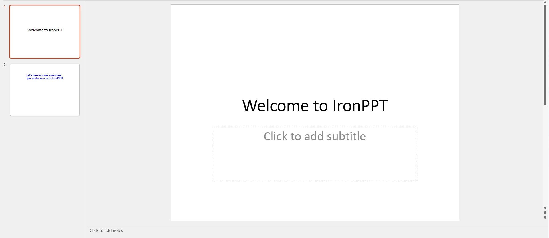 PPT 工具 如何以 C# 程式化方式建立並自動化 PowerPoint 簡報 Jacob Mellor 更新:9月 18, 2025 下載 IronPPT NuGet 下載 開始免費試用 法學碩士副本 法學碩士副本 將頁面複製為 Markdown 格式,用於 LLMs 在 ChatGPT 中打開 請向 ChatGPT 諮詢此頁面 在雙子座打開 請向 Gemini 詢問此頁面 在雙子座打開 請向 Gemini 詢問此頁面 打開困惑 向 Perplexity 詢問有關此頁面的信息 分享 在 Facebook 上分享 分享到 X(Twitter) 在 LinkedIn 上分享 複製連結 電子郵件文章 每週手動建立相同的 PowerPoint 簡報是一項繁瑣且容易出錯的任務,沒有任何開發人員喜歡做這項工作。 無論是產生每週銷售報告、每月財務摘要,還是個人化客戶提案,這些流程都非常適合自動化。 多年來,.NET 領域的首選解決方案是 Microsoft Office Interop,這項技術允許以程式方式控制 Office 應用程式。 然而,這種方法有一些明顯的缺點:它需要在伺服器上安裝授權版本的 Microsoft Office,在伺服器環境中穩定性很差,並且完全排除了在 Linux、macOS 或 Docker 容器中進行現代跨平台部署的可能性。 幸運的是,還有更好的方法。 本教學將向您展示如何使用 IronPPT for.NET(一個專為現代開發而構建的強大而輕量級的庫)在 C# 中以程式設計方式建立 PowerPoint 簡報。 我們將探索如何實現從創建簡單的幻燈片到使用模板生成複雜的、數據驅動的簡報(包括表格和圖表)的所有自動化操作。 借助 IronPPT,您可以建立快速、可擴展且可靠的簡報自動化工作流程,這些工作流程可以在任何地方運行,而無需依賴 Microsoft Office。 IronPPT - C#簡報庫 IronPPT for .NET 程式庫讓開發人員可以使用 C# 以程式設計方式建立和管理 PowerPoint 檔案。 如何使用 C# 產生 PowerPoint 文件? 使用 C# 進行 PowerPoint 自動化入門非常簡單。 IronPPT for.NET 以 NuGet 套件的形式分發,只需幾秒鐘即可直接安裝到您的 Visual Studio 專案中。 步驟 1:安裝 IronPPT 庫 在 Visual Studio 中開啟套件管理員控制台( Tools > NuGet Package Manager > Package Manager Console ),然後輸入下列命令: Install-Package IronPPT 或者,您可以在 NuGet 套件管理器 GUI 中搜尋"IronPPT",然後從那裡安裝它。 ! 透過 NuGet 套件管理器螢幕安裝 IronPPT Visual Studio 中的 NuGet 套件管理器,展示了 IronPPT 庫的安裝過程。 步驟 2:建立並儲存您的第一個簡報 安裝程式庫後,您只需幾行 C# 程式碼即可建立您的第一個 PowerPoint 簡報。 任何簡報的核心類別都是PresentationDocument 。 以下程式碼片段初始化一個新的簡報,新增一個帶有標題的幻燈片,並將其儲存為.pptx檔案。 using IronPPT; // Before using IronPPT, a license key is required. // Get a free 30-day trial key at: https://ironsoftware.com/csharp/ppt/licensing/#trial-license License.LicenseKey = "YOUR-LICENSE-KEY"; // Create a new PowerPoint presentation document var presentation = new PresentationDocument(); // Create a new slide object var slide = new Slide(); // Add text to the slide, which will be placed in a default textbox slide.AddText("Hello, World! Welcome to Programmatic PowerPoint Creation."); // Add the slide to the presentation presentation.AddSlide(slide); // Save the presentation to a.pptx file presentation.Save("MyFirstPresentation.pptx"); using IronPPT; // Before using IronPPT, a license key is required. // Get a free 30-day trial key at: https://ironsoftware.com/csharp/ppt/licensing/#trial-license License.LicenseKey = "YOUR-LICENSE-KEY"; // Create a new PowerPoint presentation document var presentation = new PresentationDocument(); // Create a new slide object var slide = new Slide(); // Add text to the slide, which will be placed in a default textbox slide.AddText("Hello, World! Welcome to Programmatic PowerPoint Creation."); // Add the slide to the presentation presentation.AddSlide(slide); // Save the presentation to a.pptx file presentation.Save("MyFirstPresentation.pptx"); Imports IronPPT ' Before using IronPPT, a license key is required. ' Get a free 30-day trial key at: https://ironsoftware.com/csharp/ppt/licensing/#trial-license License.LicenseKey = "YOUR-LICENSE-KEY" ' Create a new PowerPoint presentation document Dim presentation = New PresentationDocument() ' Create a new slide object Dim slide As New Slide() ' Add text to the slide, which will be placed in a default textbox slide.AddText("Hello, World! Welcome to Programmatic PowerPoint Creation.") ' Add the slide to the presentation presentation.AddSlide(slide) ' Save the presentation to a.pptx file presentation.Save("MyFirstPresentation.pptx") $vbLabelText $csharpLabel 執行此程式碼後,您將在專案的輸出目錄中找到一個名為MyFirstPresentation.pptx的新檔案。 開啟後將顯示一張包含您新增的文字的幻燈片。 這個簡單的範例示範了建立簡報物件、新增內容和保存檔案的基本工作流程。 ! 使用 IronPPT 建立的空白簡報 使用 C# 和 IronPPT 以程式設計方式建立的空白 PowerPoint 簡報。 如何透過程式設計方式新增和操作投影片? 簡報就是一系列投影片。 IronPPT 提供了一個簡單直覺的 API 來管理這些投影片,您可以根據應用程式的需求添加、載入和重複使用它們。 載入現有簡報並新增幻燈片 通常情況下,你需要修改現有的簡報,而不是從頭開始建立一個。 您可以透過將.pptx檔案的路徑傳遞給PresentationDocument建構函數,從磁碟載入該檔案。 載入完成後,您可以輕鬆新增新的幻燈片。 以下範例載入我們先前建立的簡報,並在其中新增一張新的空白幻燈片。 using IronPPT; // Load an existing PowerPoint presentation var presentation = new PresentationDocument("MyFirstPresentation.pptx"); // Add a new blank slide to the end of the presentation