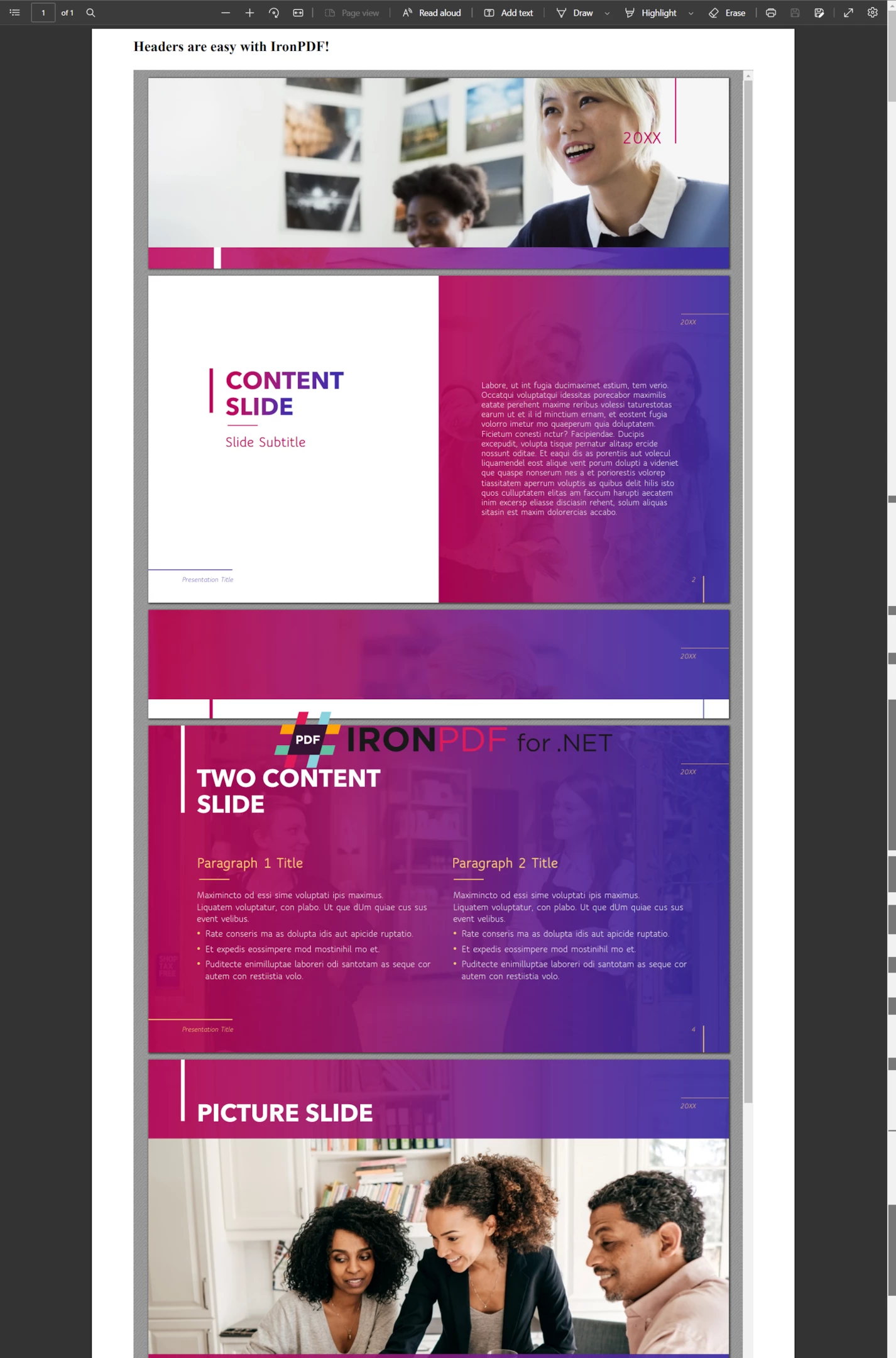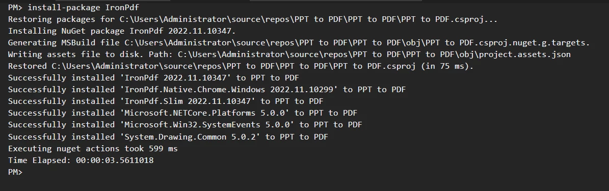 使用 IRONPPT 用 C# 將 PPT (PowerPoint) 轉換為 PDF (範例教學) Jordi Bardia 更新:7月 28, 2025 下載 IronPPT NuGet 下載 開始免費試用 法學碩士副本 法學碩士副本 將頁面複製為 Markdown 格式,用於 LLMs 在 ChatGPT 中打開 請向 ChatGPT 諮詢此頁面 在雙子座打開 請向 Gemini 詢問此頁面 在雙子座打開 請向 Gemini 詢問此頁面 打開困惑 向 Perplexity 詢問有關此頁面的信息 分享 在 Facebook 上分享 分享到 X(Twitter) 在 LinkedIn 上分享 複製連結 電子郵件文章 使用 C# 將 PowerPoint 簡報轉換為 PDF 可以提高業務營運效率,實現簡報的快速建立、輕鬆更新和分享。 這種轉換還能確保與各種設備和程式相容,從而節省時間並提高效率。 隆重介紹IronPPT :Iron Software 出品的 .NET PowerPoint 庫IronPPT 可無縫載入並儲存 PPTX 文件,無需 Microsoft Office。它非常適合在任何 .NET 應用程式中自動執行幻燈片、文字、形狀和圖像的操作。立即開始使用 IronPPT! 本教學課程示範如何使用 IronPDF 庫在 C# 中將 PowerPoint 簡報轉換為 PDF。 如何使用 C# 將 PPT(PowerPoint)轉換為 PDF 安裝 C# 庫以將 PowerPoint 文件轉換為 PDF 文件。 將PowerPoint演示文稿轉換為HTML文件 使用RenderHtmlFileAsPdf方法從 HTML 檔案產生 PDF 文件 可選地為新PDF添加自定義的頁眉和頁腳 保存具有與PowerPoint相同設計的PDF IronPDF:.NET PDF 函式庫 IronPDF 是一個 .NET PDF 庫,它使 C# 和 VB 開發人員能夠輕鬆地在 .NET 應用程式中建立、編輯和操作 PDF 文件。 IronPDF 提供出色的渲染功能,支援使用 IronPDF 將 HTML 轉換為 PDF 、使用 IronPDF 將 URL 轉換為 PDF 、SVG 轉換為圖像、HTML 文件轉換為 PDF 等等。 IronPDF 擅長根據網頁或現有的 HTML/CSS 範本產生報告、發票、報表和收據的 PDF 文件。 IronPDF 庫的一個關鍵功能是,它可以用來填寫現有的 PDF 表單,也可以從頭開始建立新的 PDF 表單。 這使得企業能夠透過IronPDF 自動建立和填寫表單來簡化其文件工作流程。 此外,IronPDF 還可以輕鬆地添加頁眉和頁腳、為 PDF 添加浮水印以及為 PDF 文件添加頁碼。 這使其成為創建專業外觀 PDF 的理想解決方案。 讓我們來看看如何使用 IronPDF 將 PowerPoint 簡報轉換為 PDF 文件。 先決條件 將 .ppt 檔案轉換為 PDF 文件有一些前提條件。 Visual Studio 2022(推薦) 正在執行的 .NET 應用程序,並安裝了最新的 .NET Framework(建議) 已安裝 Microsoft Office 需要穩定的網路連線才能安裝用於 PDF 轉換的 IronPDF 庫 接下來我們來看看將 .ppt 檔案轉換為 PDF 的主要步驟。 步驟 1:將 PowerPoint 簡報匯出為 HTML 格式 第一步是將 PowerPoint 文件轉換為 HTML,然後使用匯出的 HTML 轉換為 PDF 文件。 若要將 .ppt 檔案匯出為 HTML 格式,請執行下列操作: 開啟Zamzar PPT 前往 HTML線上轉換器工具。 將 PowerPoint 文件上傳到 Zamzar 網站。 點選"立即轉換"按鈕。 ! 使用 C# 將 PPT(PowerPoint)轉換為 PDF(範例教學),圖 1:將 PPT 轉換為 HTML 將PPT轉換為HTML 它將開始把 PPTX 文件轉換為 HTML 文件。 步驟 2:將 IronPDF 加入到解決方案中 IronPDF 可以使用 NuGet 套件管理器或 NuGet 套件管理器控制台進行安裝。 讓我們使用軟體包管理器控制台方法來安裝 IronPDF。 轉到工具列中的"工具",然後從側邊選單中選擇"套件管理器控制台"選項。 ! 使用 C# 將 PPT(PowerPoint)轉換為 PDF(範例教學),圖 2:Visual Studio 中顯示了 NuGet 套件管理器。 NuGet 套件管理器在 Visual Studio 中顯示。 在控制台中輸入以下指令安裝 IronPDF。 Install-Package IronPPT ! 使用 C# 將 PPT(PowerPoint)轉換為 PDF(範例教學),圖 3:IronPDF 庫的安裝 IronPDF庫的安裝 現在,是時候編寫程式碼,使用 IronPDF 庫將 PowerPoint 轉換為 PDF 了。 步驟 3:將 HTML 檔案轉換為 PDF 一旦 HTML 文件可用,IronPDF 將使用 HTML 文件將 HTML 文件轉換為 PDF 文件。 將 IronPDF 新增到代碼檔案中 首先,在原始檔案的頂部新增以下程式碼行以匯入 IronPDF。 using IronPdf; using IronPdf; Imports IronPdf $vbLabelText $csharpLabel 實例化 ChromePdfRenderer 對象 現在,實例化ChromePdfRenderer物件。 這將有助於建立和自訂 PDF 文件。 var renderer = new ChromePdfRenderer(); var renderer = new ChromePdfRenderer(); Dim renderer = New ChromePdfRenderer() $vbLabelText $csharpLabel 將 HTML 檔案(從 PowerPoint 文件匯出)轉換為 PDF 讓我們使用RenderHtmlFileAsPdf方法將 HTML 檔案轉換為 PDF。 var pdf = renderer.RenderHtmlFileAsPdf(@"C:\Presentation\Presentation.html"); var pdf = renderer.RenderHtmlFileAsPdf(@"C:\Presentation\Presentation.html"); Dim pdf = renderer.RenderHtmlFileAsPdf("C:\Presentation\Presentation.html") $vbLabelText $csharpLabel PowerPoint .ppt 檔案轉換為 PDF 檔案。 讓我們來看看如何自訂生成的 PDF 文件,包括浮水印、密碼和標題。 步驟 4:在 PDF 檔案中新增浮水印、密碼和頁眉 使用 IronPDF 在 PDF 中新增浮水印 本節介紹如何在 PDF 中加入浮水印(以圖章形式)。 下面,使用ApplyStamp方法在 PDF 檔案中加入浮水印。 pdf.ApplyStamp(new ImageStamper("https://ironpdf.com/img/products/ironpdf-logo-text-dotnet.svg")); pdf.ApplyStamp(new ImageStamper("https://ironpdf.com/img/products/ironpdf-logo-text-dotnet.svg")); pdf.ApplyStamp(New ImageStamper("https://ironpdf.com/img/products/ironpdf-logo-text-dotnet.svg")) $vbLabelText $csharpLabel 為PDF新增密碼保護 為PDF文件添加密碼可以防止未經授權的存取。 IronPDF 支援為使用者和擁有者新增密碼。 您可以為使用者和管理員設定不同的密碼,以允許自訂 PDF 檔案。 pdf.Password = "EasyPassword"; pdf.Password = "EasyPassword"; pdf.Password = "EasyPassword" $vbLabelText $csharpLabel 新增