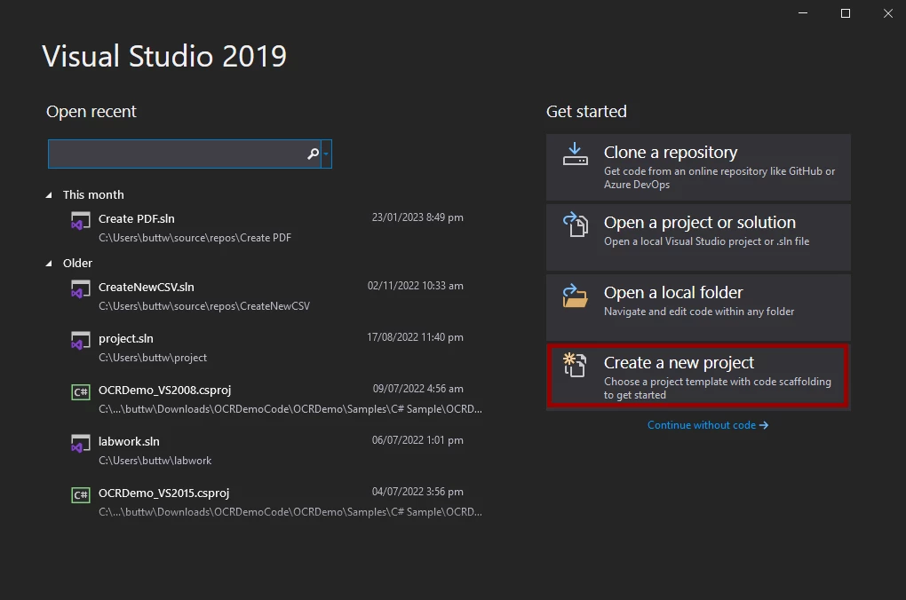 如何在不使用 Adobe 的情況下用 C# 列印 PDF 文件,圖 1:新建 Visual Studio 項目 新建 Visual Studio 項目