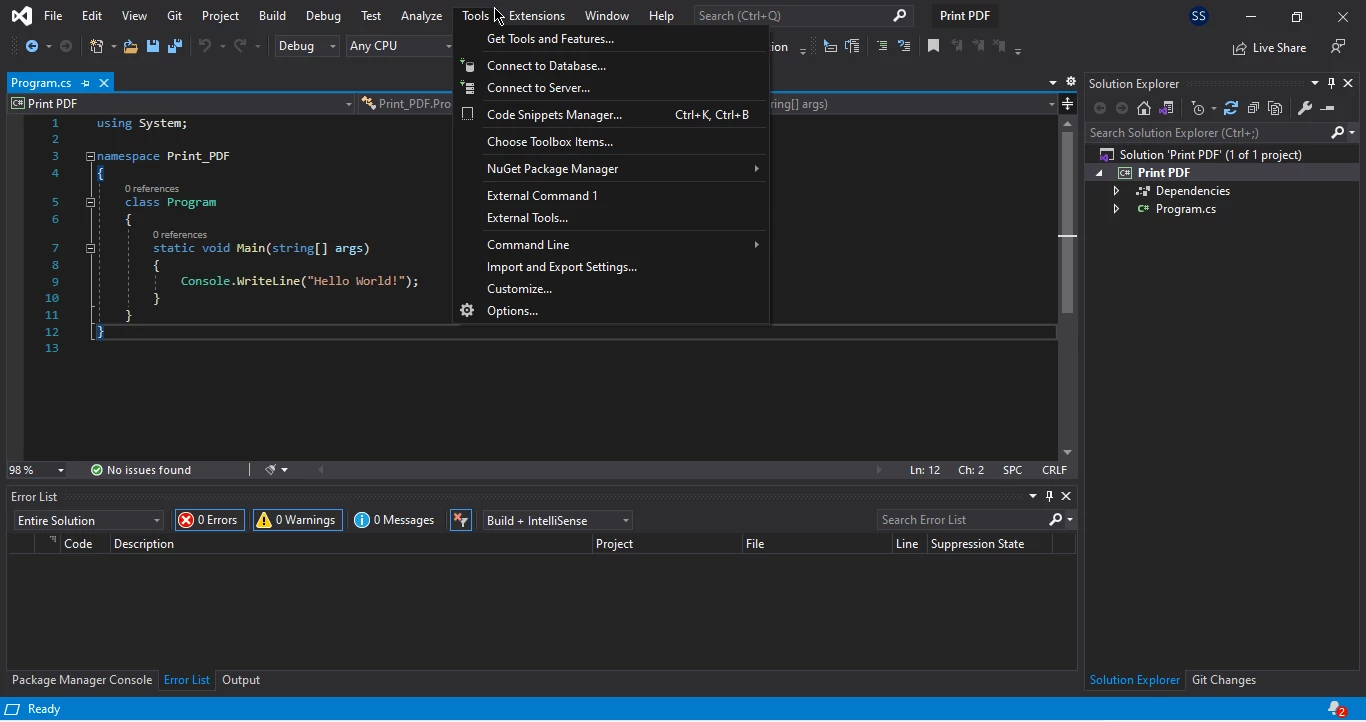 如何在不使用 Adobe 的情況下用 C# 列印 PDF 文件,圖 7:NuGet 套件管理器視窗已開啟 NuGet 套件管理器視窗打開