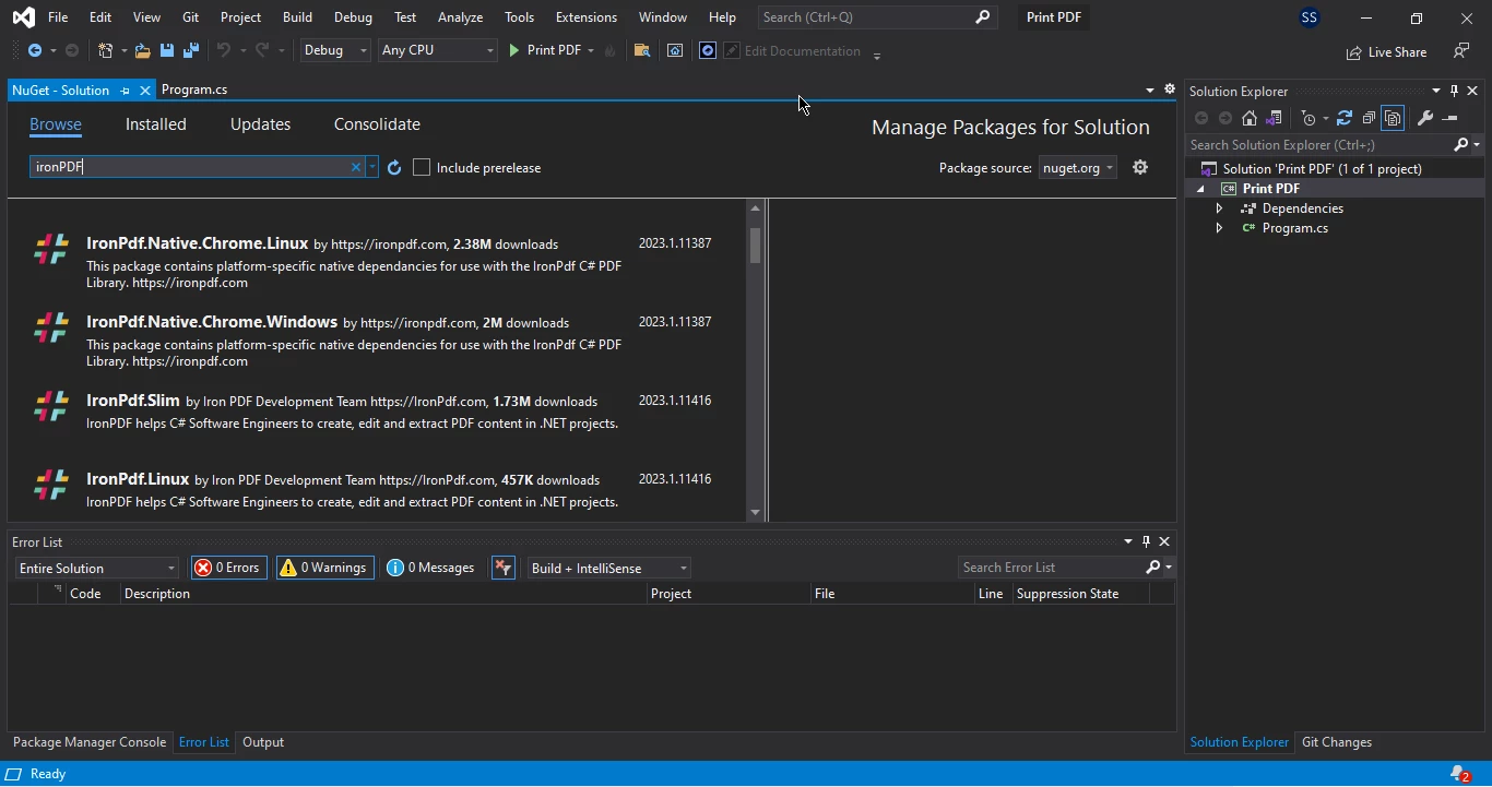 如何在不使用 Adobe 的情況下用 C# 列印 PDF 文件,圖 5:NuGet 套件管理器 UI NuGet 套件管理器使用者介面