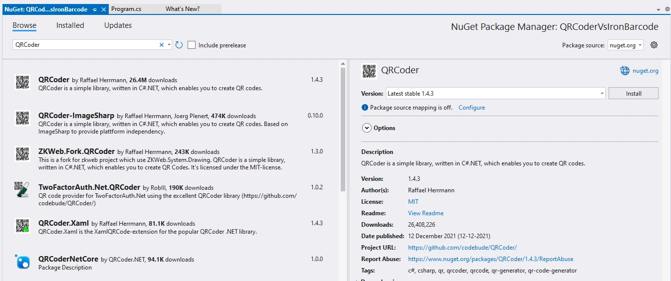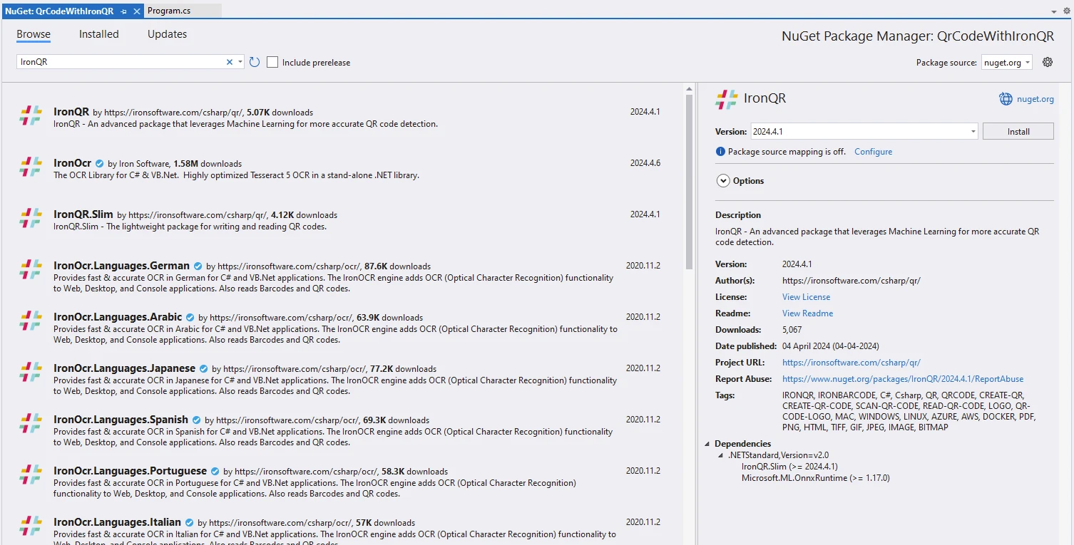 更新7月 28, 2025 如何在 Visual Studio 中產生 QR 碼 另外,您也可以使用 Visual Studio NuGet Package Manager 介面,搜尋 "IronQR" 並選擇最新的穩定版本。 閱讀更多