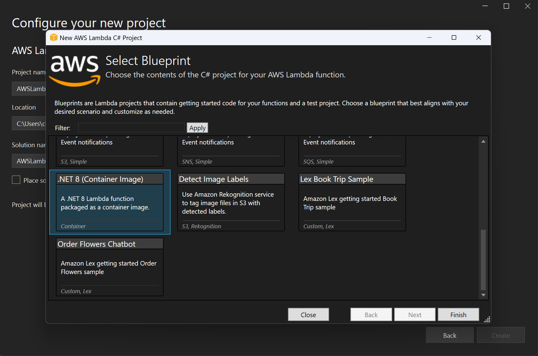 IronQR 開始 在 AWS 上設定 如何在 AWS Lambda 上讀取和寫入二維碼 Curtis Chau 更新:7月 22, 2025 下載 IronQR NuGet 下載 開始免費試用 法學碩士副本 法學碩士副本 將頁面複製為 Markdown 格式,用於 LLMs 在 ChatGPT 中打開 請向 ChatGPT 諮詢此頁面 在雙子座打開 請向 Gemini 詢問此頁面 在雙子座打開 請向 Gemini 詢問此頁面 打開困惑 向 Perplexity 詢問有關此頁面的信息 分享 在 Facebook 上分享 分享到 X(Twitter) 在 LinkedIn 上分享 複製連結 電子郵件文章 This article was translated from English: Does it need improvement? Translated View the article in English 本文提供了使用 IronQR 設定 AWS Lambda 函數的詳細指南。 在本教程中,您將學習如何配置 IronQR,以便直接向 S3 儲存桶讀取和寫入二維碼。 如何在 AWS Lambda 上讀取和寫入二維碼 下載用於讀寫二維碼的 C# 庫 創建 AWS Lambda 容器化專案模板 修改 Dockerfile 和 FunctionHandler 代碼 增加記憶體和超時設置 部署並調用函數以在 S3 中查看結果 安裝 本文將使用 S3 儲存桶,因此需要AWSSDK.S3包。 立即開始在您的項目中使用 IronQR 並免費試用。 第一步: 免費啟動 建立 AWS Lambda 項目 使用 Visual Studio,建立容器化的 AWS Lambda 函數非常簡單: 安裝適用於 Visual Studio 的 AWS 工具包 選擇"AWS Lambda 專案(.NET Core - C#)" 選擇".NET 8(容器映像)"藍圖,然後選擇"完成"。 !選擇容器影像 新增包依賴項 .NET 8 中的 IronQR 函式庫可在 AWS Lambda 上執行,無需額外的相依性。 若要進行配置,請如下所示修改專案的 Dockerfile: FROM public.ecr.aws/lambda/dotnet:8 # Install necessary packages and update repositories RUN dnf update -y WORKDIR /var/task # This COPY command copies the .NET Lambda project's build artifacts from the host machine into the image. # The source of the COPY should match where the .NET Lambda project publishes its build artifacts. If the Lambda function is being built # with the AWS .NET Lambda Tooling, the `--docker-host-build-output-dir` switch controls where the .NET Lambda project # will be built. The .NET Lambda project templates default to having `--docker-host-build-output-dir` # set in the aws-lambda-tools-defaults.json file to "bin/Release/lambda-publish". # # Alternatively, Docker multi-stage build could be used to build the .NET Lambda project inside the image. # For more information on this approach, check out the project's README.md file. COPY "bin/Release/lambda-publish" . 修改函數處理程序程式碼 此範例產生一個二維碼,將其上傳到 S3 儲存桶,並讀取新產生的二維碼。 檔案路徑在 IronQrNuget 目錄中指定,檔案名稱使用全域唯一識別碼 (GUID)。 Write方法根據提供的值產生二維碼,然後將產生的 JPG 位元組數組傳遞給Read方法以讀取二維碼。 這證明該 AWS Lambda 函數能夠讀取二維碼。 using Amazon.Lambda.Core; using Amazon.S3; using Amazon.S3.Model; using IronQr; // Assembly attribute to enable the Lambda function's JSON input to be converted into a .NET class. [assembly: LambdaSerializer(typeof(Amazon.Lambda.Serialization.SystemTextJson.DefaultLambdaJsonSerializer))] namespace IronQrNuGetAwsLambda { public class Function { private static readonly IAmazonS3 _s3Client = new AmazonS3Client(Amazon.RegionEndpoint.APSoutheast1); /// <summary> /// Main handler for AWS Lambda /// </summary> /// <param name="context">The ILambdaContext that provides methods for logging and describing the Lambda environment.</param> /// <returns></returns> public async Task FunctionHandler(ILambdaContext context) { // Set the license key for IronQR IronQr.License.LicenseKey = "IronQR-MYLICENSE-KEY-1EF01"; string bucketName = "deploymenttestbucket"; string objectKey = $"IronQrNuget/{Guid.NewGuid()}.png"; try { // Create a QR code with the content "12345" var myQr = QrWriter.Write("12345"); context.Logger.LogLine("QR created."); // Upload the JPG to S3 await UploadJpgToS3Async(bucketName, objectKey, myQr.Save().ExportBytesAsJpg()); context.Logger.LogLine($"QR uploaded successfully to {bucketName}/{objectKey}"); // Read the QR code QrImageInput imageInput = new QrImageInput(myQr.Save()); QrReader reader = new QrReader(); var resultFromByte = reader.Read(imageInput); foreach (var item in resultFromByte) { // Log the read value context.Logger.LogLine($"QR value is = {item.Value}"); } } catch (Exception e) { context.Logger.LogLine($"[ERROR] FunctionHandler: {e.Message}"); } } // Function to upload the JPG file to S3 private async Task UploadJpgToS3Async(string bucketName, string objectKey, byte[] jpgBytes) { using (var memoryStream = new MemoryStream(jpgBytes)) { var request = new PutObjectRequest { BucketName = bucketName, Key = objectKey, InputStream = memoryStream, ContentType = "image/jpg", }; await _s3Client.PutObjectAsync(request); } } } } using Amazon.Lambda.Core; using Amazon.S3; using Amazon.S3.Model; using IronQr; // Assembly attribute to enable the Lambda function's JSON input to be converted into a .NET class. [assembly: LambdaSerializer(typeof(Amazon.Lambda.Serialization.SystemTextJson.DefaultLambdaJsonSerializer))] namespace IronQrNuGetAwsLambda { public class Function { private static readonly IAmazonS3 _s3Client = new AmazonS3Client(Amazon.RegionEndpoint.APSoutheast1); /// <summary> /// Main handler for AWS Lambda /// </summary> /// <param name="context">The ILambdaContext that provides methods for logging and describing the Lambda environment.</param> /// <returns></returns> public async Task FunctionHandler(ILambdaContext context) { // Set the license key for IronQR IronQr.License.LicenseKey = "IronQR-MYLICENSE-KEY-1EF01"; string bucketName = "deploymenttestbucket"; string objectKey = $"IronQrNuget/{Guid.NewGuid()}.png"; try { // Create a QR code with the content "12345" var myQr = QrWriter.Write("12345"); context.Logger.LogLine("QR created."); // Upload the JPG t