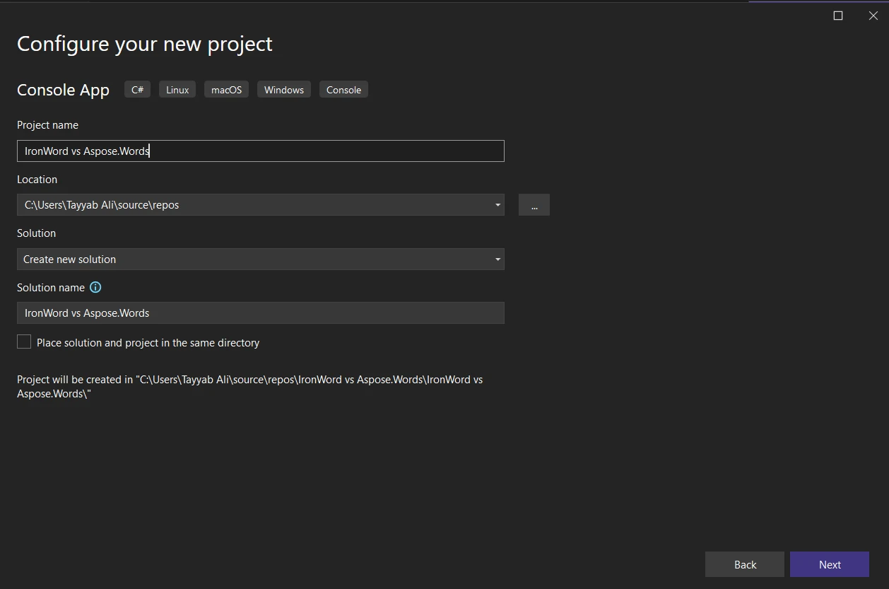 在 Visual Studio 中建立用於操作 IronWord 或 Aspose.Words 的控制台應用程式是一個簡單的過程。 本節將引導您完成設定基本控制台應用程式的步驟,該應用程式稍後可用於整合 IronWord 功能。
