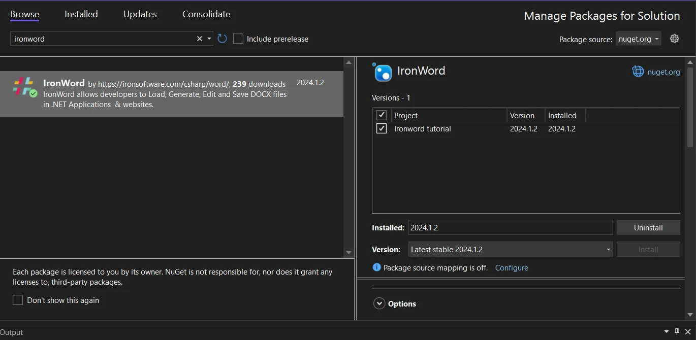 IronWord 與 Aspose Words for .NET 的比較:圖 3 - 在 NuGet 套件管理器中安裝 IronWord