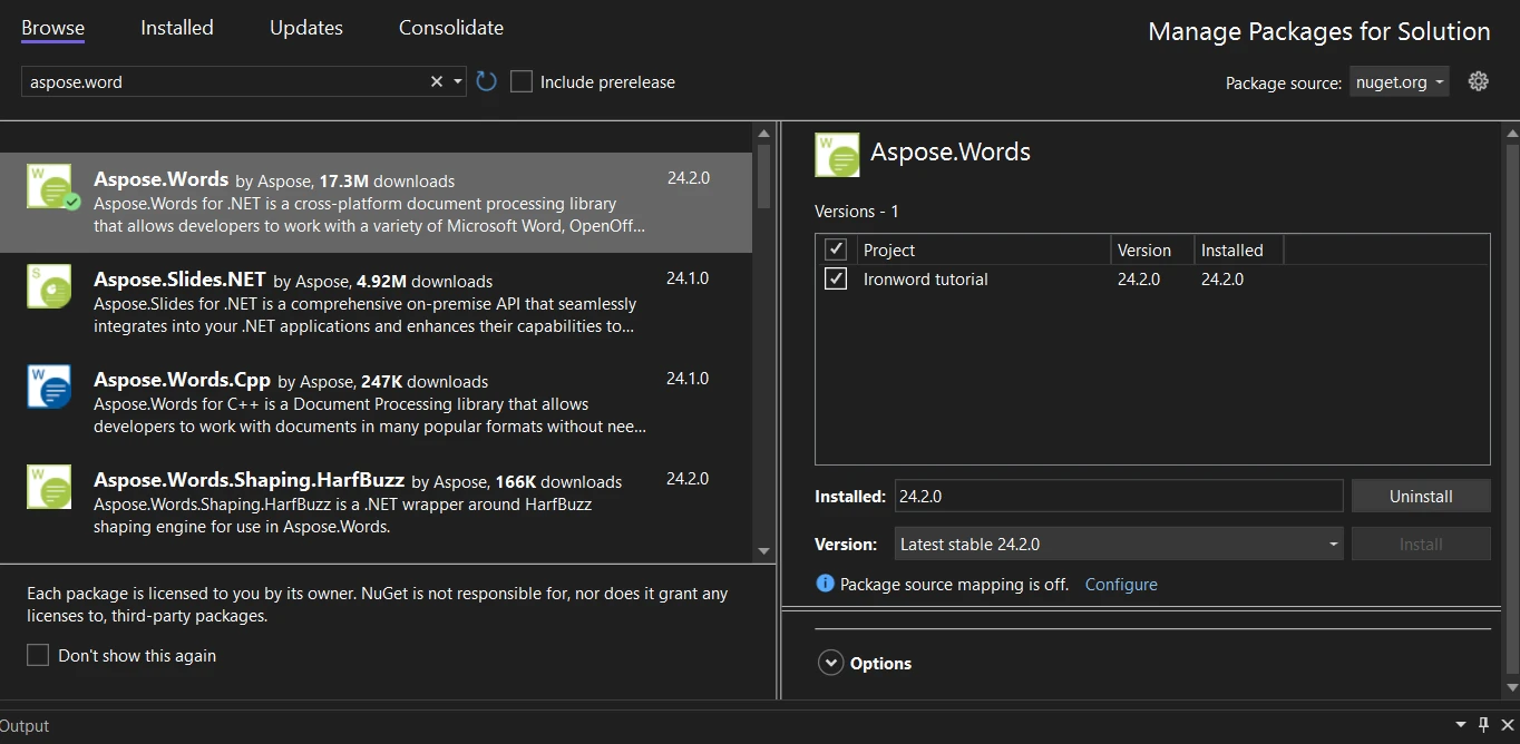 IronWord 與 Aspose Words for .NET 的比較:圖 4 - 在 NuGet 套件管理器中安裝 Aspose.Words