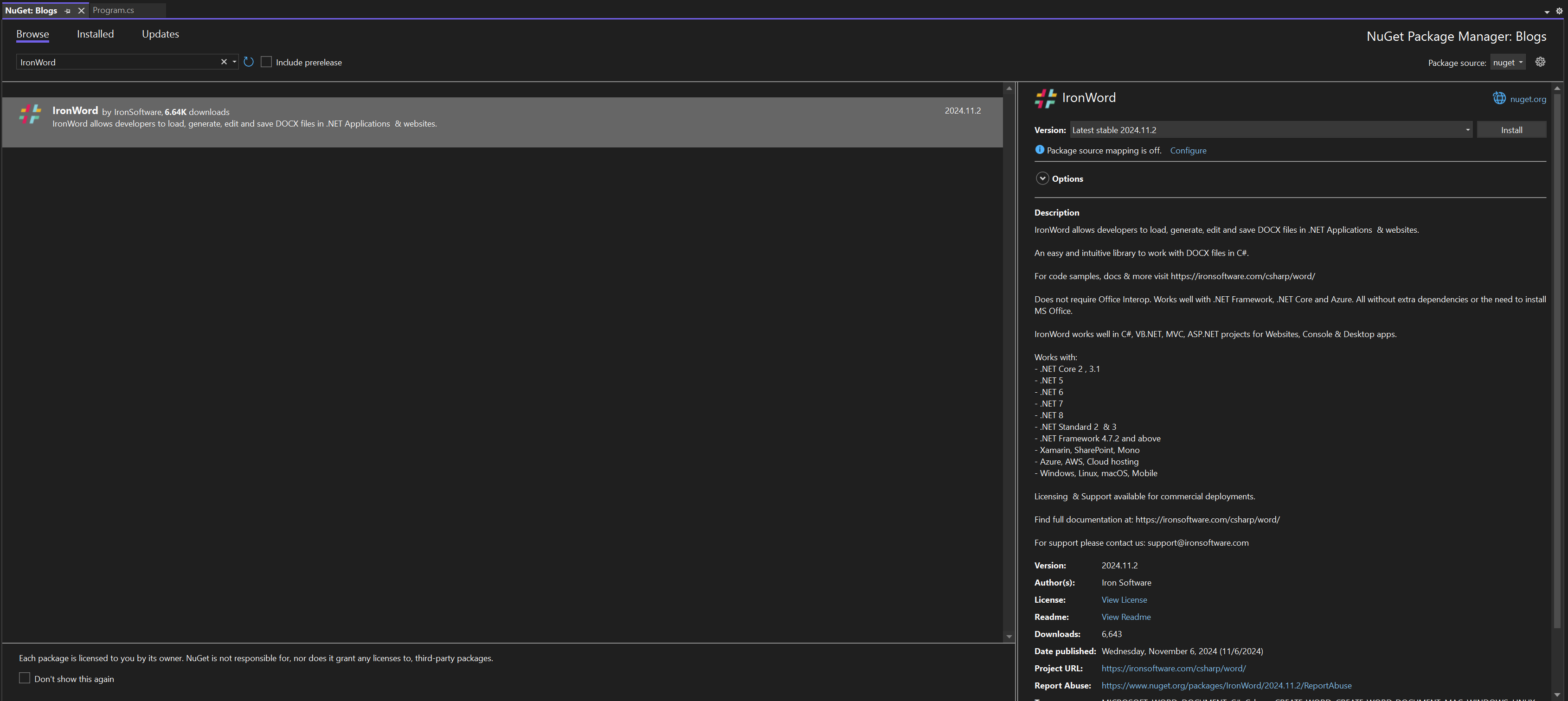 若要安裝 IronWord,請使用 Visual Studio 中的 NuGet 套件管理器。搜尋“IronWord”,並將其新增至您的專案中即可開始處理 Word 文件。