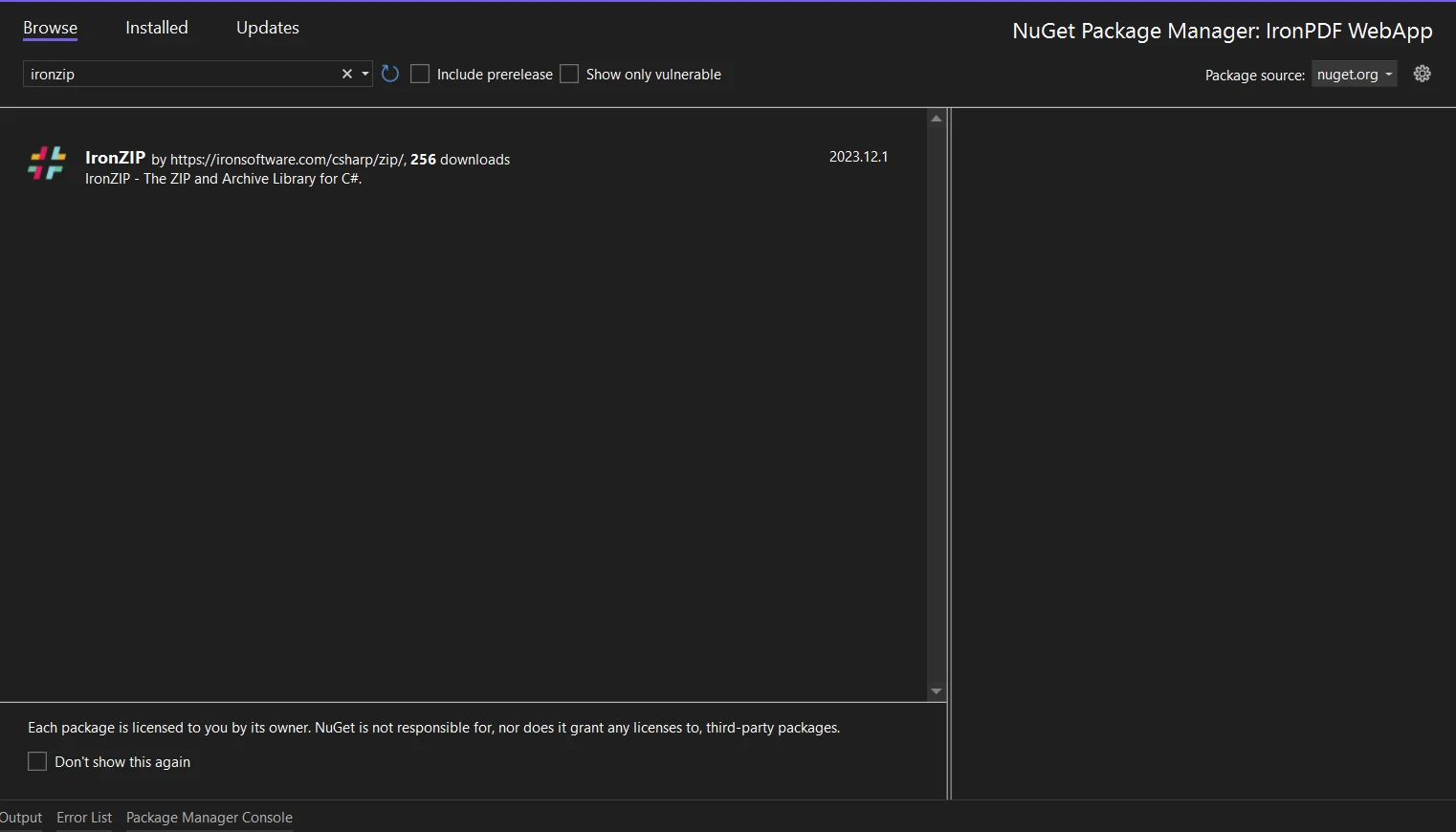 使用 IRONZIP 如何在 .NET Core 中解壓縮檔案 Curtis Chau 更新:7月 28, 2025 下載 IronZIP NuGet 下載 開始免費試用 法學碩士副本 法學碩士副本 將頁面複製為 Markdown 格式,用於 LLMs 在 ChatGPT 中打開 請向 ChatGPT 諮詢此頁面 在雙子座打開 請向 Gemini 詢問此頁面 在雙子座打開 請向 Gemini 詢問此頁面 打開困惑 向 Perplexity 詢問有關此頁面的信息 分享 在 Facebook 上分享 分享到 X(Twitter) 在 LinkedIn 上分享 複製連結 電子郵件文章 1.簡介 "解壓縮"是指將檔案和資料夾從 ZIP 壓縮包中取出並解壓縮的過程。 "Unzip" refers to the process of recovering compressed files or directories back to their original condition, so that they can be accessed and used again after being compressed into a ZIP file. 我們可以將各種類型的檔案新增到 zip 檔案中,例如圖像、TXT 檔案等。 使用者可以透過解壓縮來檢索 ZIP 檔案的內容,解壓縮是壓縮過程的逆過程。 存取為了更有效地傳輸、儲存或共用而打包在一起的單一檔案或資料夾是其常見用途。 "解壓縮"過程完成後,檔案將恢復其原始結構,使用者可以根據需要讀取、更改或使用它們。 在本文中,我們將使用 IronZIP 歸檔庫在 Asp.net core 中解壓縮檔案。 2. 在 Asp.net Core 中,解壓縮檔案摘要 建立一個新的 Asp.net Core 專案。 將 IronZIP 庫安裝到已建立的專案中。 若要解壓縮文件,請實例化IronArchive類別。 可以使用ExtractArchiveToDirectory函數來提取 ZIP 檔案。 指定需要將解壓縮檔案提取到的目標檔案。 3. IronZIP庫 Iron Software 創建了 .NET 庫IronZIP ,該程式庫使在 .NET 應用程式中處理和管理 ZIP 檔案變得更加容易。 它為程式設計師提供各種工具和功能,以便他們能夠以多種方式與 ZIP 進行互動。 這些操作包括產生、提取、壓縮、解壓縮、加密和修改 ZIP 檔案內的檔案和目錄。 3.1 IronZIP 的特點 ZIP 檔案建立: .NET 應用程式從一開始就能產生全新的 ZIP 檔案。 *提取和解壓縮:*從預先存在的 ZIP 套件中刪除檔案和目錄並解壓縮內容的能力。 壓縮:提供將檔案和資料夾縮小到 ZIP 檔案中的工具,以便於傳輸或儲存。 密碼保護和加密:為了保護 ZIP 壓縮檔案的內容,此功能提供了應用密碼保護和加密 ZIP 檔案的功能。 檔案操作:這允許程式設計師新增、刪除、更新或以其他方式操作 ZIP 套件中的檔案和目錄。 相容性:可在各種 .NET 環境中運行,相容於該框架的多個版本。 效能最佳化:**旨在最大限度地提高速度,以便 .NET 程式能夠更有效地管理大型 ZIP 檔案或資料集。 開發人員在管理應用程式的 ZIP 檔案時,可能會發現 IronZIP 是一個有用的工具。 在 .NET 框架內,它提供了多種以程式設計方式處理 ZIP 檔案的功能,兼具簡單性和多功能性。 如需了解有關功能、特性、相容性以及後續版本新增功能的最新詳情,請參閱官方文件、發行說明或 IronZIP 網站,因為軟體庫會隨著時間的推移而更新和改進。了解更多信息,請點擊此處。 3.2 在 Visual Studio 中建立新項目 啟動 Visual Studio 程式後,選擇"檔案"選項。 選擇"新建專案",然後選擇"Asp.Net core Web 應用程式"。 在對應的文字方塊中,輸入項目名稱並選擇檔案位置。 接下來,按一下"建立"按鈕,然後選擇所需的 .NET Framework 版本。 現在,所選應用程式的結構將由 Visual Studio 專案產生。 本例中使用的是 ASP.NET MVC。 因此,我們有兩種選擇:要么使用當前的控制器,允許您添加程式碼並建立/運行應用程序,要么創建一個新的控制器。 然後可以添加庫,並測試程式碼。 4. IronZIP軟體包下載 4.1 使用 Visual Studio 您可以使用 Visual Studio 的 NuGet 套件管理器功能,直接將套件安裝到您的解決方案中。 您可以使用下面的截圖存取 NuGet 套件管理器。 如何在 .NET Core 中解壓縮檔案:圖 1 - 如何存取 NuGet 套件管理器 它提供了一個搜尋框,可以調出 NuGet 網站上的套件清單。下面的螢幕截圖顯示如何在套件管理器中尋找"IronZIP"這個詞組。 如何在 .NET Core 中解壓縮檔案:圖 2 - 在 NuGet 套件管理器中搜尋 IronZIP 上圖顯示了相關的搜尋字詞清單。 若要安裝解決方案包,必須選擇所需的選項。 4.2 使用 Visual Studio 命令列。 在 Visual Studio 中,選擇"工具">"NuGet 套件管理員"以查看套件管理員控制台。 在軟體包管理器的終端機標籤中輸入以下命令: Install-Package IronZip 下載並安裝到活動項目後,該軟體包即可使用。 4.3 直接從 NuGet 網站下載 第三種方法是直接從網站取得NuGet 套件。 點擊連結即可打開。 從右側選單中選擇下載包選項。 下載完成後,雙擊該軟體包。 它會自動安裝。 再次載入解決方案,並在專案中開始使用它。 4.4 直接從 IronZIP 網站下載 點擊此連結直接從網站取得最新軟體包。下載完成後,請按照隨附的步驟將軟體包新增至專案。 在解決方案視窗中右鍵點選選擇項目。 選擇參考文獻,並在下載完成後瀏覽其位置。 然後按一下"確定"新增引用。 4.5 在 ASP.NET Core 中解壓縮文件 要使用 C# 中的 IronZIP 從 ZIP 檔案中提取特定文件,您需要提供檔案名稱和要提取文件的目標位置。 程式碼範例如下: using Microsoft.AspNetCore.Mvc; using Microsoft.AspNetCore.Mvc.RazorPages; using IronZip; namespace IronPDF_WebApp.Pages { public class IndexModel : PageModel { private readonly ILogger<IndexModel> _logger; public IndexModel(ILogger<IndexModel> logger) { _logger = logger; } public IActionResult OnPost() { try { // Retrieve the uploaded file from the form var file = Request.Form.Files[0]; // Set the file path where t