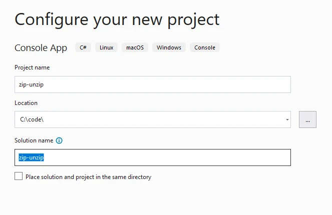 使用 IRONZIP 如何在 C# 中開啟 Zip 檔案 Curtis Chau 更新:6月 22, 2025 下載 IronZIP NuGet 下載 開始免費試用 法學碩士副本 法學碩士副本 將頁面複製為 Markdown 格式,用於 LLMs 在 ChatGPT 中打開 請向 ChatGPT 諮詢此頁面 在雙子座打開 請向 Gemini 詢問此頁面 在雙子座打開 請向 Gemini 詢問此頁面 打開困惑 向 Perplexity 詢問有關此頁面的信息 分享 在 Facebook 上分享 分享到 X(Twitter) 在 LinkedIn 上分享 複製連結 電子郵件文章 ZIP 是一種支援無損資料壓縮的歸檔條目檔案系統格式。 ZIP 檔案可能包含一個或多個已壓縮的檔案或目錄。 ZIP 檔案格式支援多種壓縮演算法,其中 DEFLATE 是最常用的。 隨後,許多軟體工具很快便支援了ZIP格式。 主流作業系統廠商早已在系統中加入了對 ZIP 壓縮檔案的支援。微軟從 Windows 98 開始就加入了對 ZIP 檔案的支持,其他廠商也紛紛效法。 在本部落格中,我們將探索一種使用IronZIP開啟 ZIP 壓縮檔案或提取檔案的現代、簡單且高效的方法。 我們將學習有關 ZIP 檔案的基本知識及其優點。 接下來,我們將看到系統命名空間中可用於處理 ZIP 檔案格式的選項。 然後,我們將探索打開 ZIP 文件的分步指導,將 ZIP 文件提取到臨時文件夾,創建新 ZIP 文件並向現有 ZIP 文件添加文件。 在軟體應用程式中使用 ZIP 檔案的優勢 1.壓縮:此技術使用各種壓縮演算法(如 Implode、Deflate、Deflate64、bzip2、LZMA、WavPack、PPMd 等)來減少歸檔檔案/資料夾的大小。 2.傳輸時間縮短:檔案越小,傳輸速度越快,尤其是透過網路傳送檔案時。 這對於電子郵件附件以及從網站上傳或下載檔案尤其有利。 3.檔案合併: ZIP 檔案可以將多個檔案合併到一個檔案中,從而減少需要管理的檔案數量。 這對於組織專案或分發由多個文件組成的軟體非常有用。 4.密碼保護:許多 ZIP 工具提供對壓縮檔案進行密碼保護的選項,為您的檔案增加一層安全性。 當您想要限制對 ZIP 檔案內容的存取時,這非常有用。 使用 IronZip 建立 ZIP 壓縮檔案並解壓縮 ZIP 文件 IronZIP 庫的介紹和文件可以在這裡找到。 在 C# 應用程式中,可以透過多種方式建立和提取 ZIP 檔案。 IronZIP NuGet 套件具備將檔案歸檔為不同格式(ZIP、TAR、GZIP 和 BZIP2)的所有功能。以下範例步驟展示如何在現代應用程式編程中使用 IronZIP 來建立新一代應用程序,例如開啟 ZIP 檔案、解壓縮 ZIP 檔案、建立新的 ZIP 檔案等。 步驟 1. 建立 .NET Core 控制台應用程式 創建專案 可以使用 Visual Studio 建立 .NET 控制台應用程式。 開啟 Visual Studio 並選擇"建立專案"。 這裡可以看到各種可用於建立專案的範本。 演示或測試程式碼最簡單的方法是建立一個控制台應用程式。 我們將選擇控制台應用程式專案範本。 如何在 C# 中開啟 Zip 檔案:圖 1 - 新建項目 請輸入項目名稱 在下面的視窗中,您可以輸入項目名稱、項目在檔案系統中的儲存位置,最後一個是解決方案資料夾的路徑。 您可以將解決方案資料夾和專案資料夾放在同一個資料夾中,也可以將它們放在不同的資料夾中。 如何在 C# 中開啟 Zip 檔案:圖 2 - 設定項目 選擇 .NET Framework 版本 下一步是為專案選擇 .NET Framework 版本。 如果您想在特定版本中進行開發,請指定您想要的版本。否則,請務必選擇最新的穩定版本來建立專案。 您可以從微軟網站下載最新版本。然後點擊"建立"以產生控制台應用程式。 如何在 C# 中開啟 Zip 檔案:圖 3 - Target Framework 這將根據範本建立預設項目,並將項目和解決方案檔案儲存在指定的目錄中。 專案創建完成後,它將類似於下圖。 有時,在最新版本中, program.cs檔案中不會使用該類別。 // Import necessary namespaces using System; // Define the namespace namespace MyApp // Note: actual namespace depends on the project name. { // Define the Program class internal class Program { // Main method: Entry point of the application static void Main(string[] args) { // Print a welcome message Console.WriteLine("Hello, World!"); } } } // Import necessary namespaces using System; // Define the namespace namespace MyApp // Note: actual namespace depends on the project name. { // Define the Program class internal class Program { // Main method: Entry point of the application static void Main(string[] args) { // Print a welcome message Console.WriteLine("Hello, World!"); } } } ' Import necessary namespaces Imports System ' Define the namespace Namespace MyApp ' Note: actual namespace depends on the project name. ' Define the Program class Friend Class Program ' Main method: Entry point of the application Shared Sub Main(ByVal args() As String) ' Print a welcome message Console.WriteLine("Hello, World!") End Sub End Class End Namespace $vbLabelText $csharpLabel 要建立一個新的 ZIP 檔案並提取所有 ZIP 歸檔文件,我們可以使用預設庫中的 System.IO.Compression。 以下程式碼示範如何使用ZipFile.OpenRead和ZipFile.Open靜態方法來開啟 ZIP 檔案或提取 ZIP 檔案。 // Import necessary namespaces using System; using System.IO; using System.IO.Compression; public class ZipExample { public static void Main() { Console.WriteLine("-----------Zip - Unzip-----------"); // Method to add a file entry to the ZIP archive static void AddEntry(string filePath, ZipArchive zipArchive) { // Get file name from the file path var file = Path.GetFileName(filePath); // Create a new entry in the ZIP archive for the file zipArchive.CreateEntryFromFile(filePath, file); } // Name of the ZIP file to be created var zip = "myFile.zip"; // Open or create the ZIP file for updating using (ZipArchive archive = ZipFile.Open(zip, ZipA