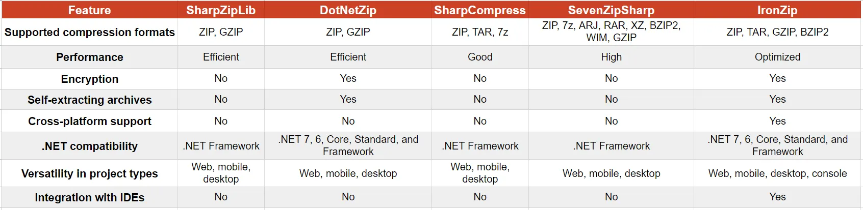 總之,C# zip 函式庫的選擇取決於特定的專案需求、偏好和所需的功能集。 這裡討論的每個庫都有其優勢,開發人員應該根據自己的具體需求仔細評估它們。 以下是上述 zip 庫的簡要比較表:
