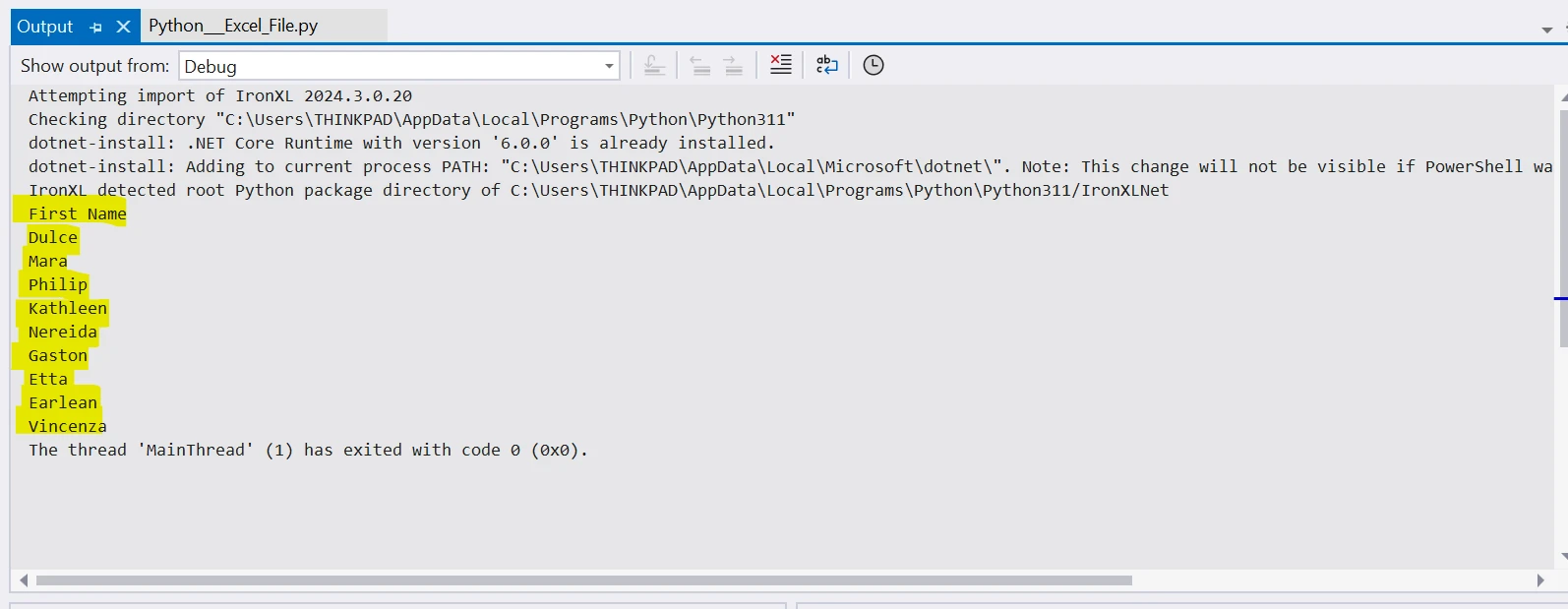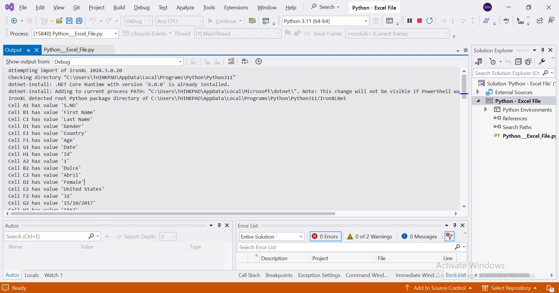 使用 IRONXL FOR PYTHON 如何在 Python 中檢視 Excel 檔案 Curtis Chau 更新:6月 22, 2025 下載 IronXL pip 下載 開始免費試用 法學碩士副本 法學碩士副本 將頁面複製為 Markdown 格式,用於 LLMs 在 ChatGPT 中打開 請向 ChatGPT 諮詢此頁面 在雙子座打開 請向 Gemini 詢問此頁面 在雙子座打開 請向 Gemini 詢問此頁面 打開困惑 向 Perplexity 詢問有關此頁面的信息 分享 在 Facebook 上分享 分享到 X(Twitter) 在 LinkedIn 上分享 複製連結 電子郵件文章 在本教學中,我們將探討如何使用Python有效地查看Excel檔案。 Excel 文件通常用於數據存儲,例如存儲表格數據,並且有多個 Python 庫可以很好地支援 Excel 文件,從而方便讀取和操作。 為此,我們將重點關注流行且最好的庫" IronXL "。 如何在 Python 中檢視 Excel 文件 安裝 IronXL 庫。 載入 Excel 工作簿。 指定 Excel 工作表。 選擇特定資料範圍。 在螢幕上列印選定的資料範圍。 讀取單元格值。 從 Excel 檔案讀取整行。 從 Excel 檔案讀取完整列。 Python Excel 檢視器簡介 在深入程式碼之前,讓我們先來討論一下使用 Python 查看 Excel 檔案的好處。 Python 以其簡潔性和多功能性而聞名,使其成為強大而穩健的程式語言。 透過利用 Python 函式庫,我們可以自動執行與資料分析、處理和視覺化相關的任務,包括處理 Excel 檔案。 為什麼選擇 Python 來開發 Excel? 自動化: Python 可以自動執行與 Excel 相關的重複性任務,例如資料擷取、轉換和分析。 整合: Python 可以與其他資料科學函式庫(如 NumPy、pandas 和 Matplotlib)無縫集成,從而實現全面的資料分析工作流程。 跨平台: Python 的最新版本可在多個平台上運行,因此適合不同作業系統的使用者使用。 自訂:與傳統的 Excel 巨集不同,Python 提供了根據特定需求自訂 Excel 工作流程的彈性。 在進一步討論之前,讓我們先來了解IronXL是什麼,它提供了哪些功能,以及它比其他產品有哪些優點。 為什麼選擇 IronXL? IronXL是由 Iron Software 開發和維護的 Python 庫,它允許軟體工程師在 Python 應用程式和網站中使用 Excel 和其他電子表格檔案。 以下是它的一些主要特點: 匯入資料: IronXL 可以讀取XLS 、XLSX、CSV 和 TSV 檔案中的資料。 匯出工作表:您可以將資料匯出為 XLS、XLSX、CSV、TSV 和 JSON 格式。 加密和解密: IronXL 支援使用密碼對 XLSX、XLSM 和 XLTX 檔案進行加密和解密。 Excel 公式:每次編輯工作表時,公式都會重新計算。 直覺的範圍設定:您可以使用類似"A1:B10"的語法指定範圍。 排序:可以對範圍、列和行進行排序。 單元格樣式:自訂字體、大小、背景圖案、邊框和對齊方式。 跨平台支援: IronXL 與 Windows、macOS、Linux、Docker、Azure 和 AWS 上的 Python 3.7+ 相容。 使用 IronXL 讀取 Excel 文件 讓我們一步一步來學習如何讀取Excel檔案。 步驟 1:安裝 IronXL 庫 在 Python 中處理 Excel 檔案之前,我們需要確保已安裝 IronXL 程式庫。 使用以下命令安裝。 pip install IronXL pip install IronXL SHELL 此命令會將 IronXL 庫安裝到我們的專案中。 步驟 2:載入 Excel 文件 下一步是將 Excel 工作簿載入到我們的專案中。 在本教學中,我將使用以下Excel電子表格。 如何在 Python 中檢視 Excel 檔案:圖 1 - Microsoft Excel 範例工作表 以下程式碼會將記憶體流中現有的 Excel 檔案載入到記憶體中。 from ironxl import * # Supported for XLSX files, XLS, XLSM, XLTX, CSV, and TSV License.LicenseKey = "IRONSUITE.ABC.XYZ.COM.15796-ABC.TRIAL.EXPIRES.27.MAY.2024" workbook = WorkBook.Load("test_excel.xlsx") # Load existing Excel files from ironxl import * # Supported for XLSX files, XLS, XLSM, XLTX, CSV, and TSV License.LicenseKey = "IRONSUITE.ABC.XYZ.COM.15796-ABC.TRIAL.EXPIRES.27.MAY.2024" workbook = WorkBook.Load("test_excel.xlsx") # Load existing Excel files PYTHON 上面的程式碼示範如何在 Python 中使用 IronXL 程式庫載入名為"test_excel.xlsx"的 Excel 工作簿並存取其內容。 透過設定 LicenseKey 屬性並輸入有效的許可證金鑰,該庫即可支援多種 Excel 檔案格式,包括 XLSX、XLS、XLSM、XLTX、CSV 和 TSV。您可以從這裡獲取免費的許可證密鑰。 步驟 3:選擇 Excel 電子表格 下一步是選擇一個要處理的 Excel 表格。 Excel 檔案由多個工作表組成; 因此,需要選擇一個活動電子表格。 以下代碼將指定電子表格。 # Select worksheet at index 0 worksheet = workbook.WorkSheets[0] # Select worksheet at index 0 worksheet = workbook.WorkSheets[0] PYTHON 上述程式碼行從已載入的 Excel 工作簿中選擇索引為 0 的第一個工作表,從而可以存取該特定工作表的資料和屬性,以便進行進一步的操作或分析。 步驟四:查看數據 既然我們已經加載了工作簿並選擇了電子表格,接下來讓我們編寫程式碼來讀取 Excel 檔案並列印其資料。 # Read from ranges of cells elegantly. for cell in worksheet["A1:H10"]: print("Cell {} has value '{}'".format(cell.AddressString, cell.Text)) # Read from ranges of cells elegantly. for cell in worksheet["A1:H10"]: print("Cell {} has value '{}'".format(cell.AddressString, cell.Text)) PYTHON 這段程式碼片段示範了一種使用 IronXL 庫從 Excel 工作表中的儲存格區域讀取資料的複雜方法。 它遍歷指定的儲存格範圍(本例中為 A1 到 H10),並列印出每個儲存格的位址和值。 這提供了一種簡潔有效的方法來存取和處理指定單元格範圍內的資料。 如何在 Python 中檢視 Excel 檔案:圖 2 - 使用 IronXL 遍歷指定儲存格範圍內的所有值,上述程式碼片段的範例輸出 步驟 5:讀取儲存格值 IronXL 提供了更簡單的讀取儲存格值的方法。 我們可以從