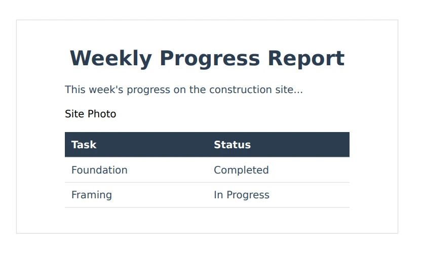 首先,你需要準備每週進度報告的內容。 這包括收集動態數據,例如專案更新、施工現場圖片和進度指標表。 例如,您可以將所有這些資訊整理成一個結構良好的 HTML 文檔,其內容可能如下所示: