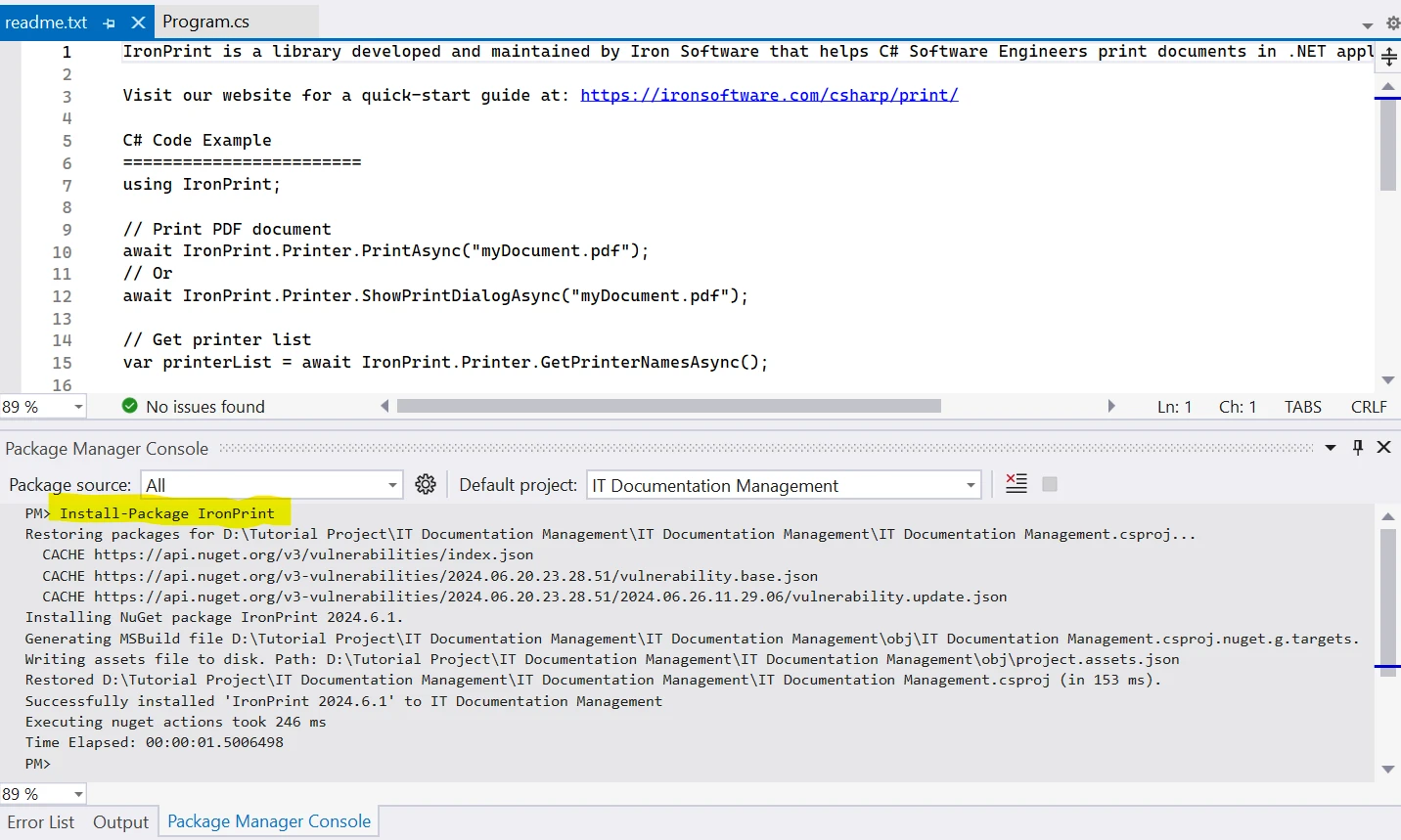 使用 C# PDF 產生器和 Iron Suite 工具提升 IT 工作流程:圖 20 - 安裝 IronPrint - NuGet 套件管理器控制台