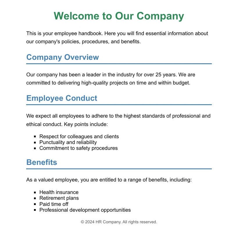 <p>This is your employee handbook. Here you will find essential information about our company's policies, procedures, and benefits.</p>