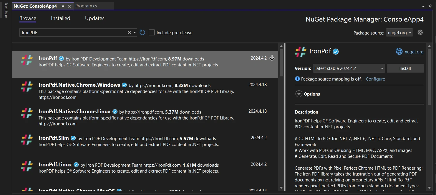 在 NuGet 套件管理器視窗中,搜尋"IronPDF"。