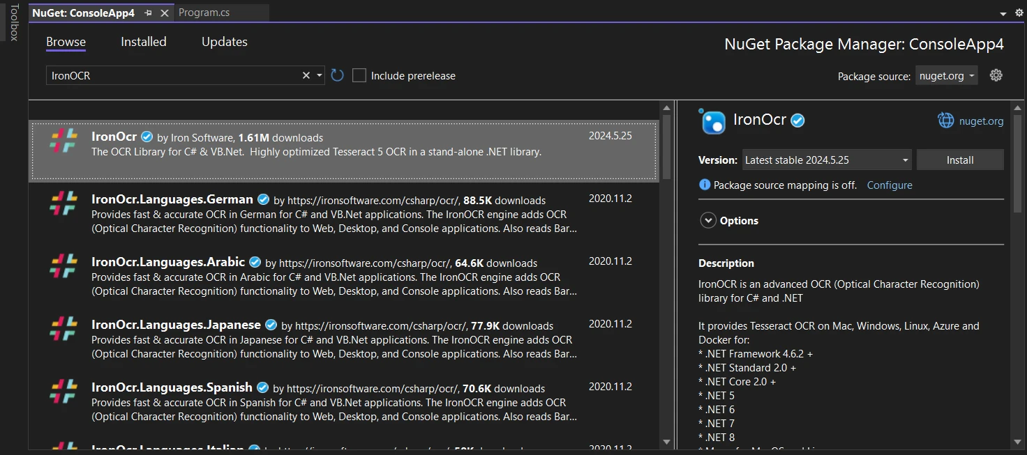 - 從搜尋結果中選擇"IronOCR",然後點選"安裝"按鈕。