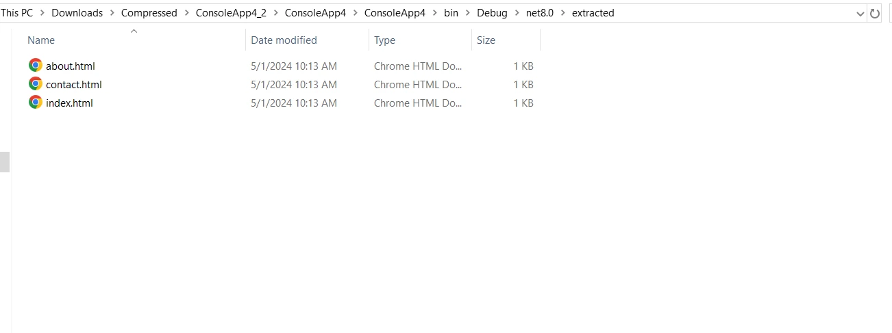 首先,我們將利用 IronZIP 直覺的 API 從 zip 壓縮包中提取 HTML 檔案。只要呼叫一個簡單的方法,我們就能有效率地提取轉換過程所需的必要檔案。