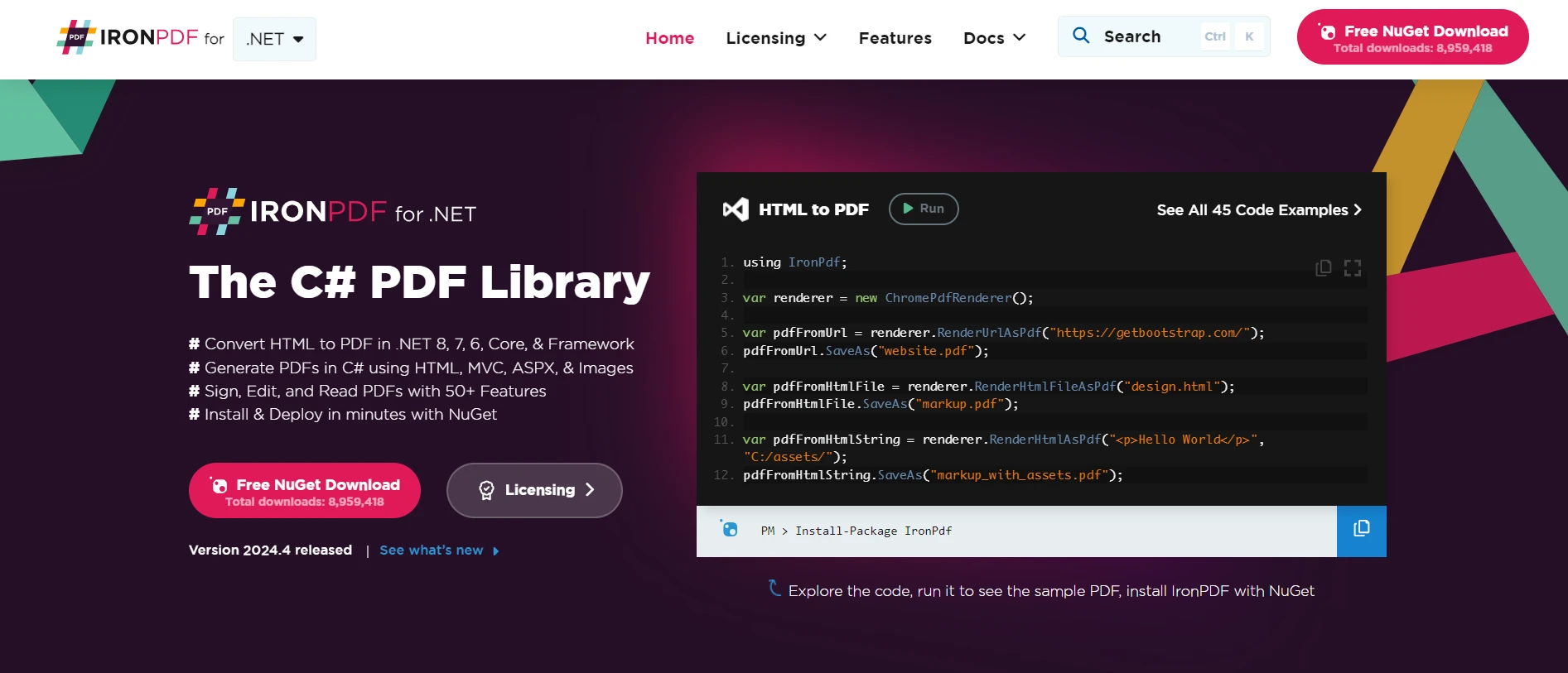 作為一個強大的 PDF 渲染和操作庫, IronPDF可以直接在 C# 程式碼中建立和操作 PDF 文件。 它具備 HTML 轉 PDF 等功能,非常適合我們將 HTML 檔案轉換為 PDF 格式的任務。